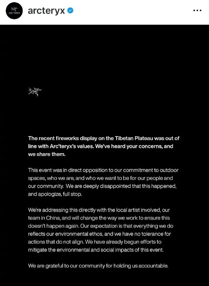 国内版道歉信中,始祖鸟表示,在对艺术表达边界评估要更专业、对自然要更谦卑,承诺在政府监管下,配合团队复核项目生态影响,邀第三方评估并依结果补救,同时推进藏地环保计划与文化公益项目。