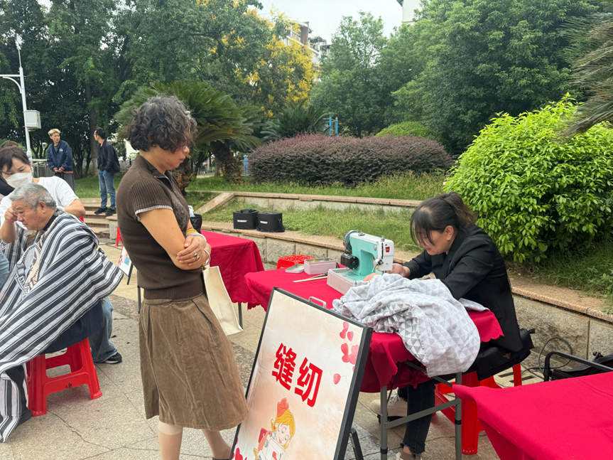 集市现场设磨刀、理发、缝补等便民服务摊位。磨刀摊位前,老师傅持磨刀石熟练打磨刀具,片刻间钝刀便变得锋利;理发摊位上,理发师手法娴熟,按需为居民修剪发型;缝补摊位里,工作人员穿针引线,仔细修补破损衣物。