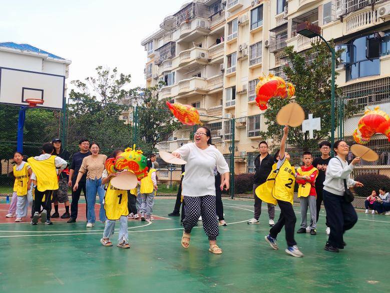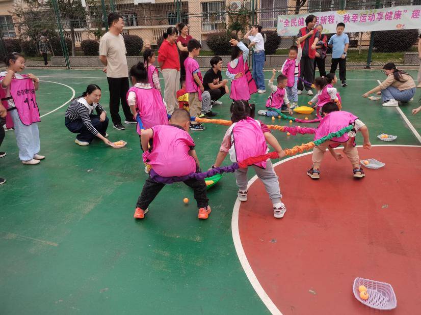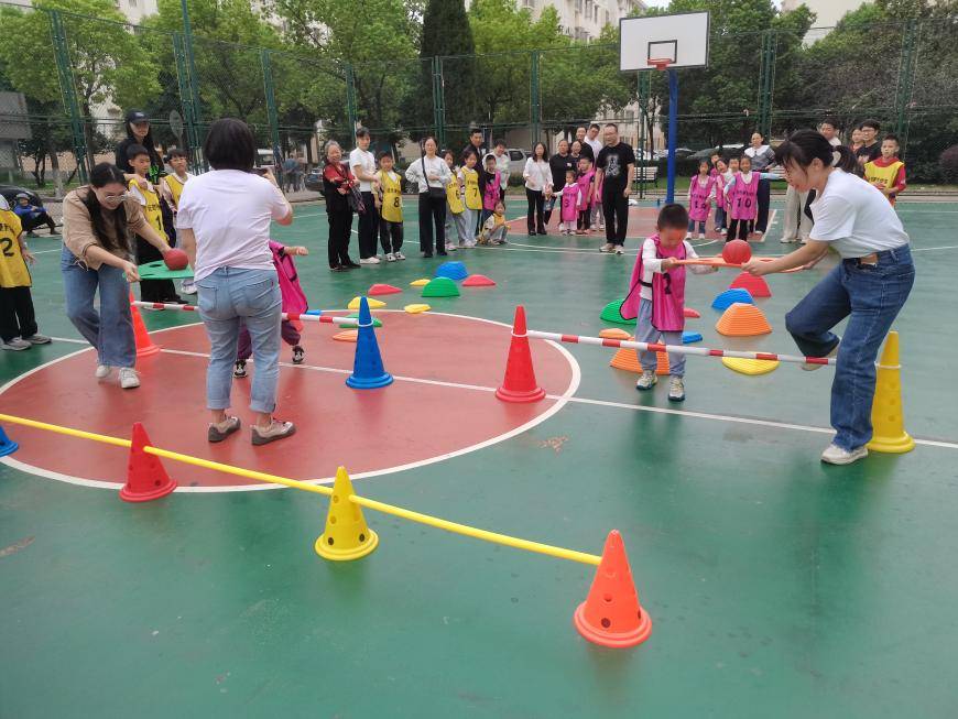 紧接着,低龄组亲子家庭各项趣味竞赛依次有序展开。在亲子障碍运球接力赛里,家长与孩子默契十足,一个眼神、一个动作,便心领神会,他们小心翼翼地运着球,巧妙地绕过一个个障碍,仿佛在完成一场精彩的冒险;“一圈到底”游戏中,大家手拉手围成一圈,让呼啦圈在身体间顺利穿梭,团队的协作与默契高下立判;“四面八方抢球赛”则充满了紧张与刺激,孩子们像敏捷的小猎豹,眼疾手快地抢夺着散落在四周的小球,欢笑声回荡在赛场的每一个角落。