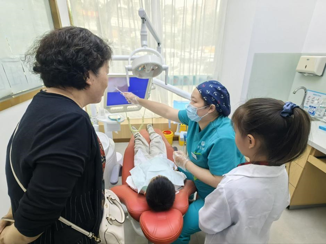 “小小牙医体验”环节将活动推向高潮。在医护人员耐心指导和全方位安全保障下,学生们分批坐上牙科诊疗椅,亲手操作检查工具,有模有样地为小伙伴进行“口腔检查”。医护人员细致讲解检查要点,同时向陪同家长反馈孩子口腔状况、提供专业建议。