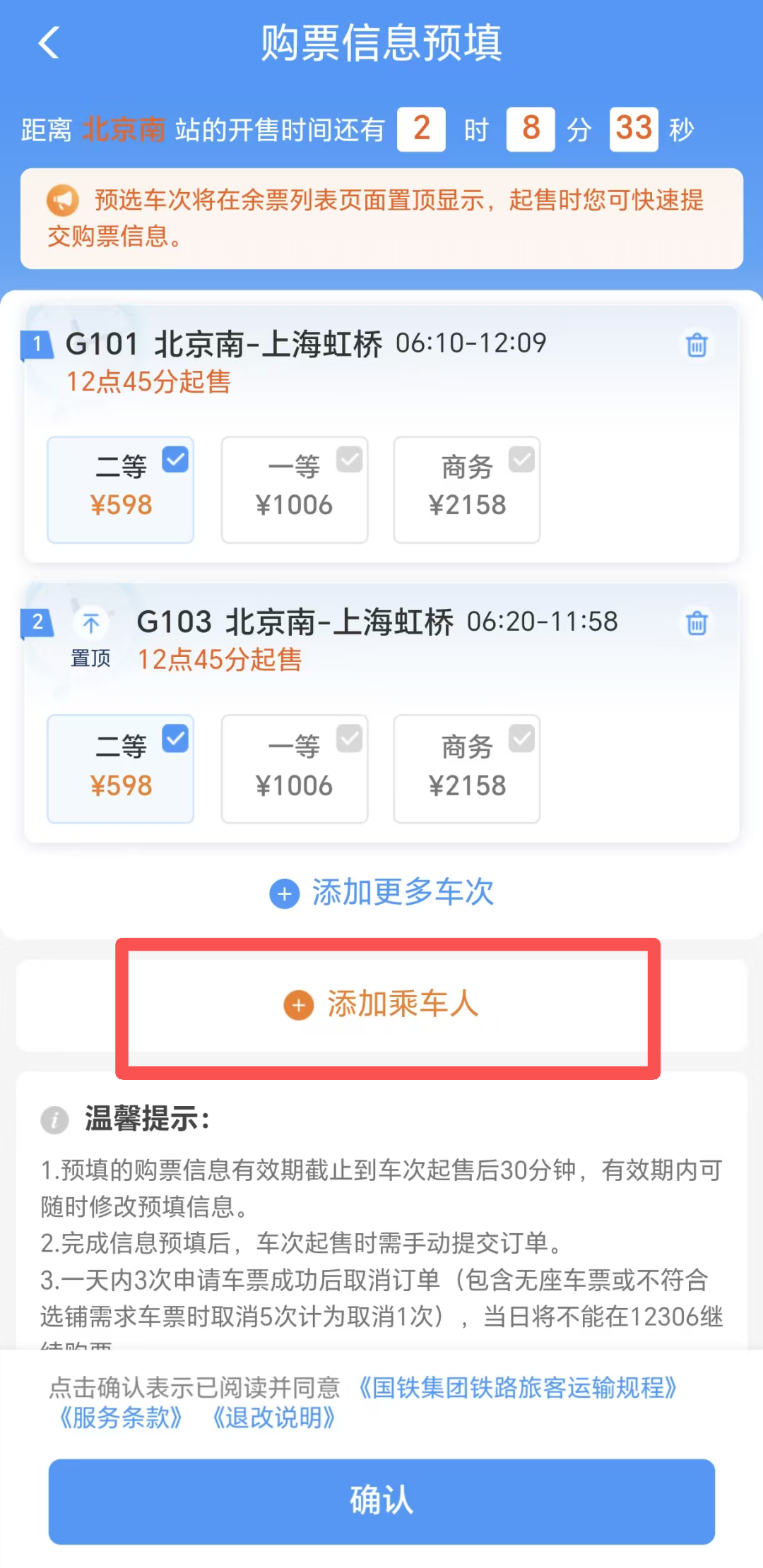 按照需求添加不同的车次和席别
