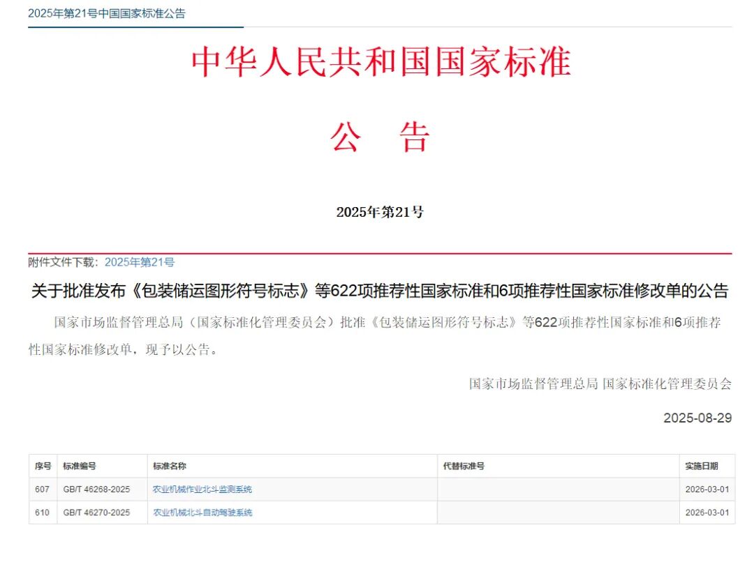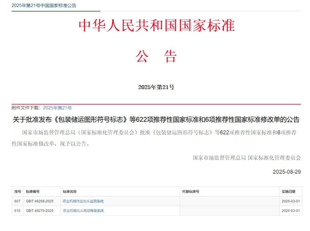 湖北日报讯(记者崔逾瑜、通讯员王林松、实习生袁旻)近日,国家市场监督管理总局、国家标准化管理委员会发布2025年第21号公告,批准发布622项推荐性国家标准和6项推荐性国家标准修改单。其中,由武汉依迅北斗时空技术股份有限公司参与制定的国家标准GB/T 46268-2025《农业机械作业北斗监测系统》和GB/T 46270-2025《农业机械北斗自动驾驶系统》正式获批,将于2026年3月1日起实施。这是我国首次针对高端智能化农机装备制定的系统性国家标准,标志着农业机械化向“精准化、智能化、网联化”转型迈入规范化发展新阶段。