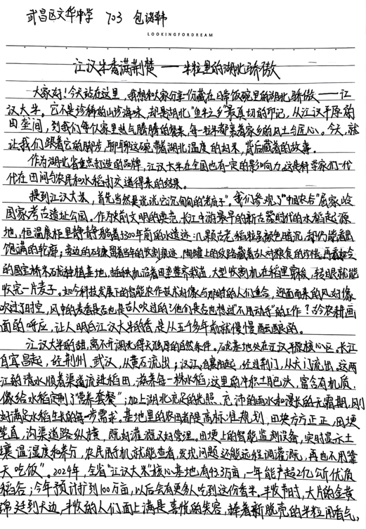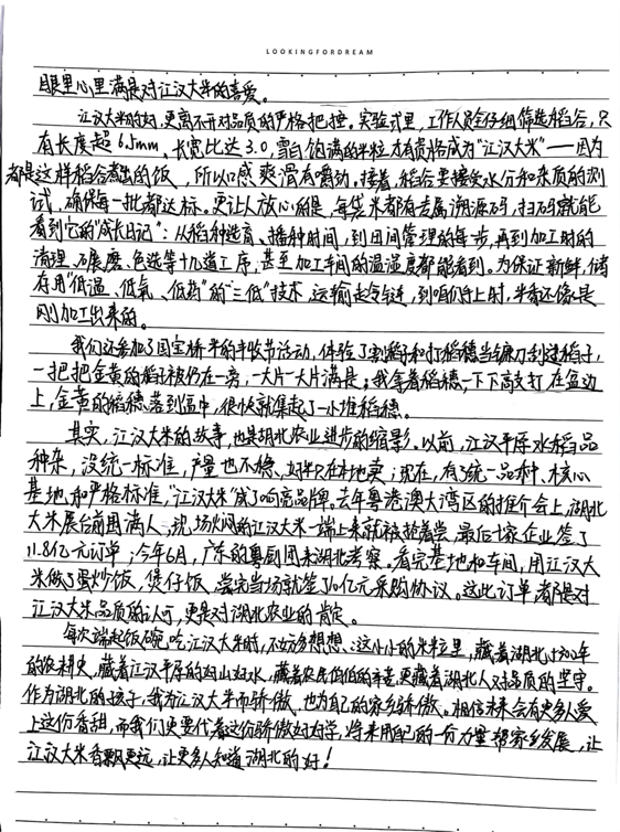 每次端起饭碗吃江汉大米时,不妨多想想:这小小的米粒里,藏着湖北5300年的农耕史,藏着江汉平原的好山好水,藏着农民伯伯的辛苦,更藏着湖北人对品质的坚守。作为湖北的孩子,我为江汉大米骄傲,也为家乡骄傲。相信未来会有更多人爱上这份香甜,而我们更要带着这份骄傲好好学习,将来用自己的力量帮助家乡发展,让江汉米香飘得更远,让更多人知道湖北的好!