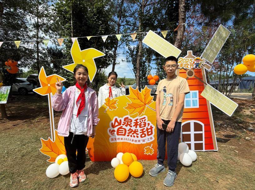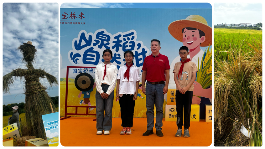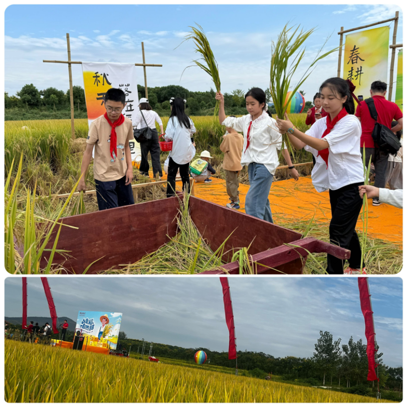 我们参加了国宝桥米丰收节活动,亲身体验了割稻与打稻穗的农事。当镰刀划过稻秆时,一束束稻穗散落田间,金灿灿的稻浪铺展成片;我手持稻秆反复敲打盆沿,饱满的谷粒簌簌坠落,转眼便在盆底堆成金黄的小丘。