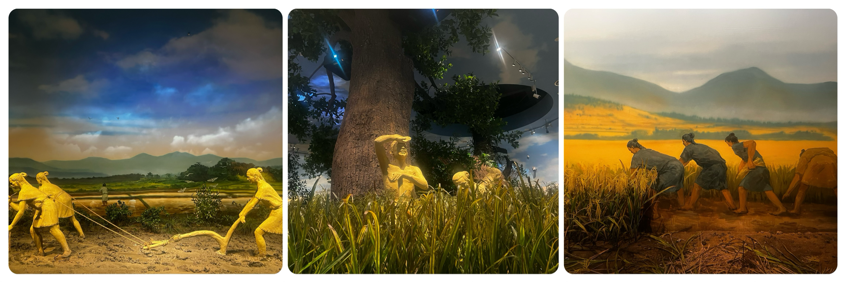 提到江汉大米,首先啊当然是说说它沉甸甸的“老底子”。我们参观了“中国农谷”屈家岭国家考古遗址公园。作为史前农业文明的典范,长江中游最早的新石器时代的水稻起源地,恒温展柜里静静躺着5300年前的水稻遗迹:几颗古老稻粒虽颜色暗沉,却仍能看出饱满轮廓;旁边的石镰留着当年收割的痕迹,陶罐上的纹路藏着古人对粮食的珍惜。再看如今的国宝桥米石龙种植基地,插秧机沿着田垄整齐栽苗,大型收割机在稻田里穿梭,转眼就能收完一片稻子。如今科技发展下的智能农作技术好像与那时的人们渐渐重合,迎面而来的风好像吹过了时空,风中的麦香是否也是古人闻到的?那时的人们是否也想过“不用动手”的工作?古今农耕画面的呼应,让人明白江汉大米的香,是从五千多年前就慢慢酝酿的。