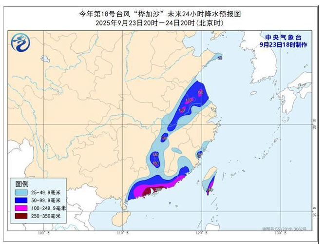 降水预报:23日20时至24日20时,广东大部、福建东北部和南部、浙江南部、台湾岛、江苏大部、安徽中南部、湖北东部、江西北部和西部、湖南东部等地部分地区有大到暴雨,其中,广东中东部沿海、福建南部、台湾岛东部、江苏中部、安徽中部、江西西部、湖南东南部等地部分地区有大暴雨,广东中部、台湾岛东南部等地部分地区特大暴雨(250-350毫米)。