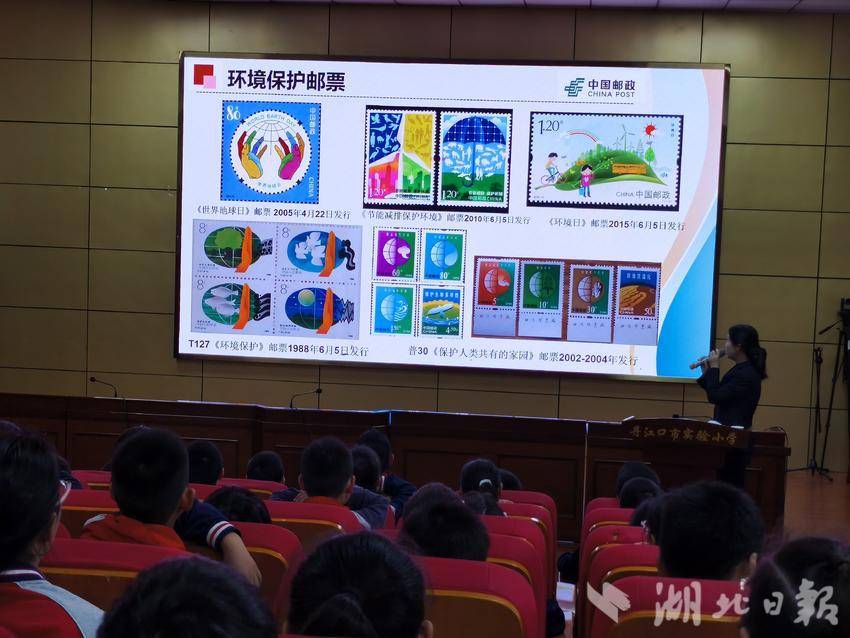 当屏幕切换到环境保护主题邮票展示环节时,现场气氛更是热烈。《世界地球日》邮票上彩色的手环绕地球,传递着守护家园的信念;《节能减排保护环境》邮票用鲜明的色彩对比展现环保行动的多元;从不同年代、不同角度诠释着环保理念。工作人员结合邮票发行背景和设计巧思,将丹江口库区“一泓清水永续北上”环保知识融入其中,让学生们在欣赏邮票艺术的同时,深刻理解“保护环境,人人有责”的意义。