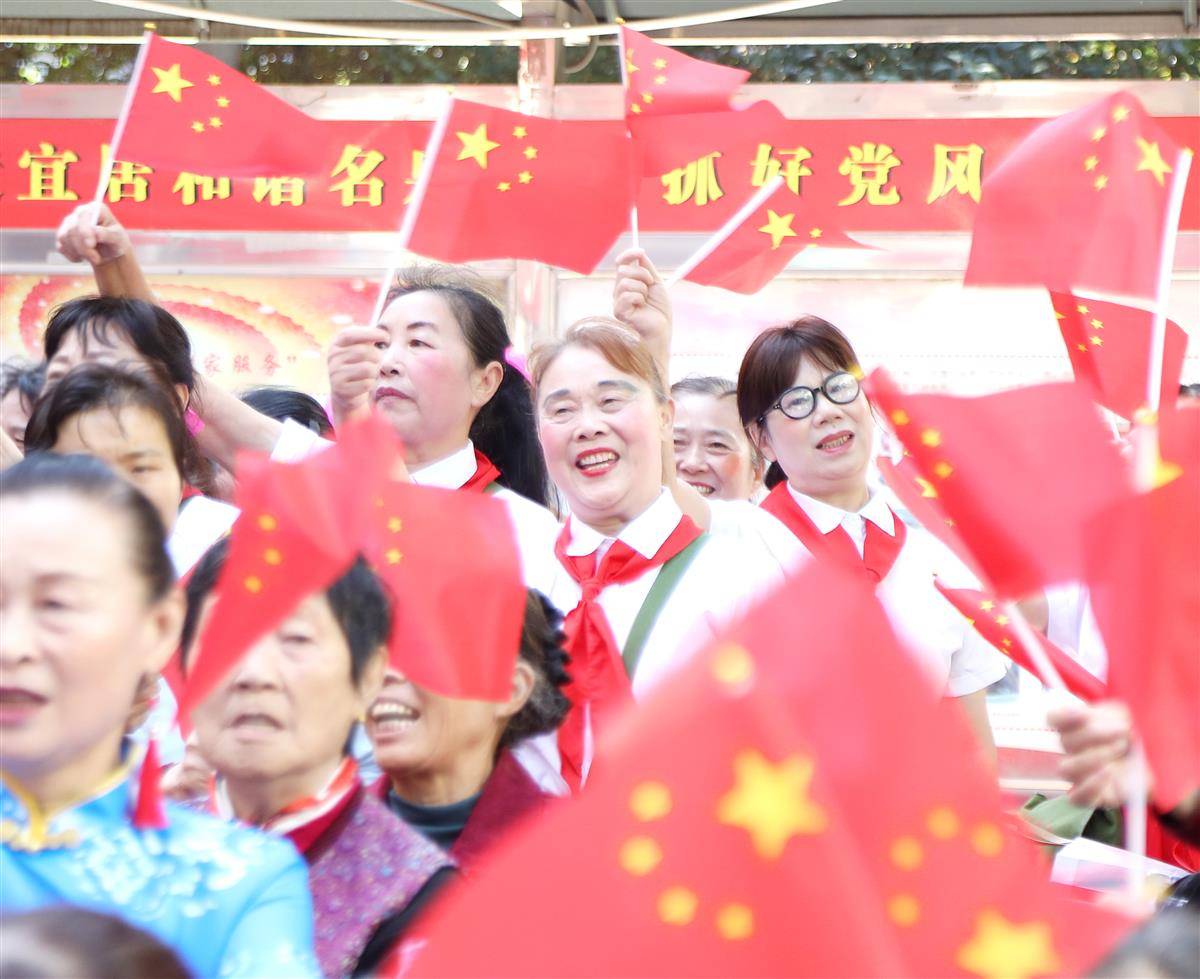 居民手中挥舞着国旗,齐声歌唱祖国。