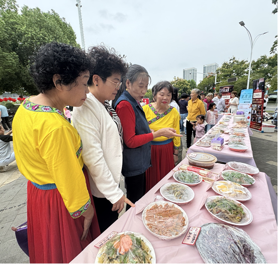 最令人瞩目的是“长桌宴”环节,20米长的餐桌上摆满社区居民精心准备的特色美食,既有香辣虾、辣子鸡等特色炒菜,凉拌莴笋丝、藕片等清爽凉菜,手工糍粑、葱香油条等中式点心,也有戚风蛋糕、法棍面包等西式糕点,宛如一幅多彩美食画卷,吸引着居民的味蕾。