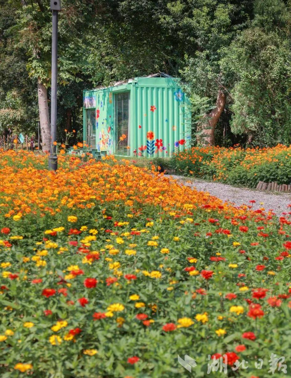 5000平方米的湖光花海正值盛花期,硫华菊与百日草交织成缤纷海洋。