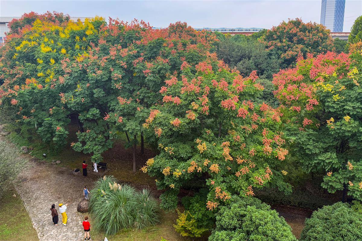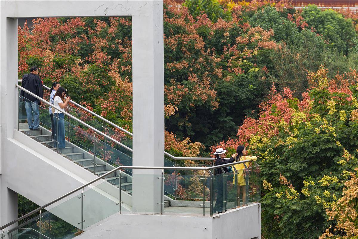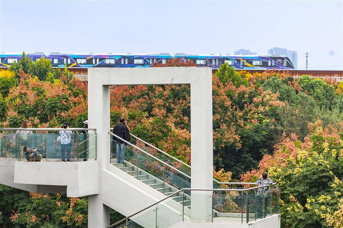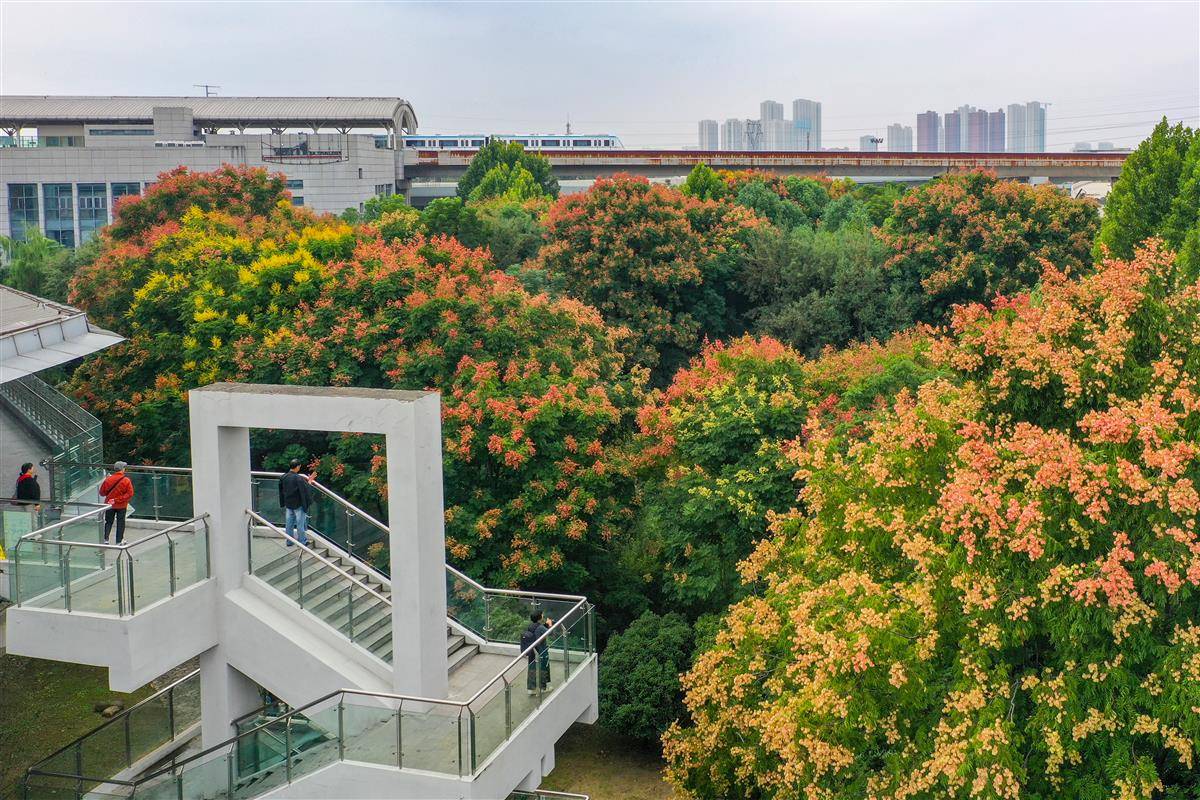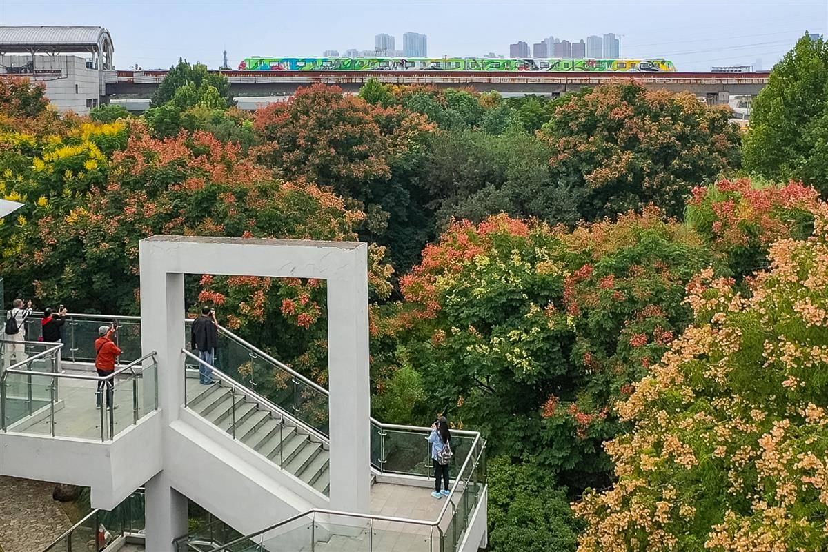9月26日,武汉地铁1号线竹叶海站外,彩色涂装的地铁列车与高架外绚烂的栾树构成秋日绝景——粉紫渐变的栾树果实如珠帘般垂挂,与彩色主题列车相映成趣,明艳色彩碰撞出强烈视觉冲击。不少市民驻足拍摄,以栾树为前景、列车为背景定格秋色,成为市民朋友圈的刷屏美景。(湖北日报全媒记者 倪娜 通讯员 产启斗 摄)