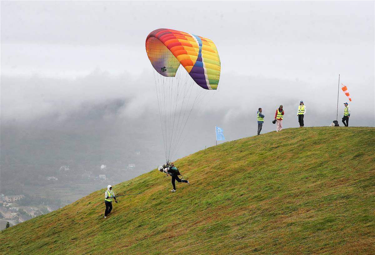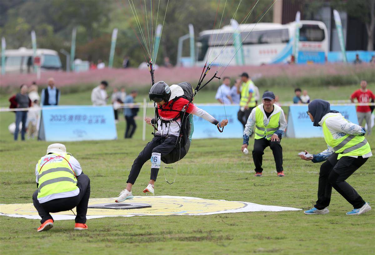 湖北日报讯(记者张诗秋、通讯员赵平)一阵时速6米/每秒的北风,吹开长约9米的伞衣,选手们站在山上拉动伞绳、奔跑、腾空,几分钟后精准降落在半径仅为16厘米的电子靶心上。9月27日,2025年滑翔伞定点世界杯总决赛在荆门市东宝区圣境山生态旅游区启幕,19国45位滑翔伞高手齐聚于此,这也是国际航联认证的全球滑翔伞定点冠军,连续第三年从荆门这片天空诞生。