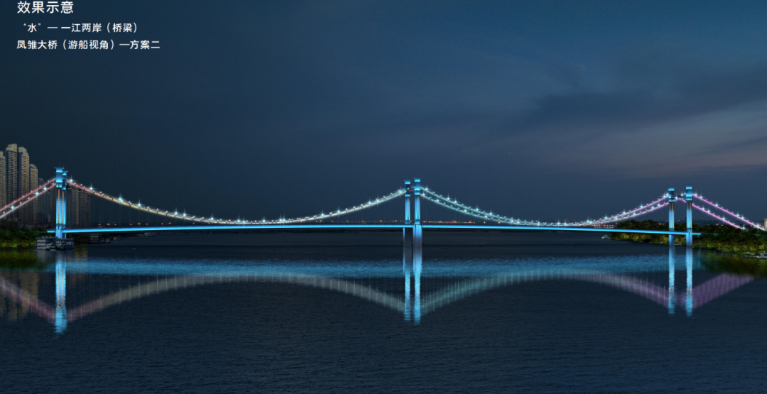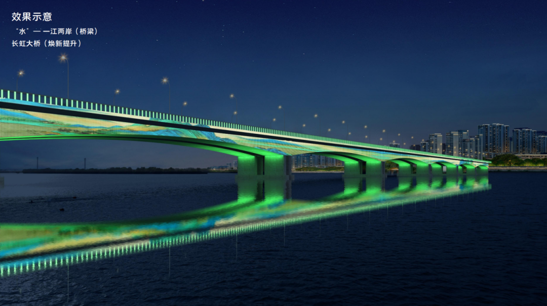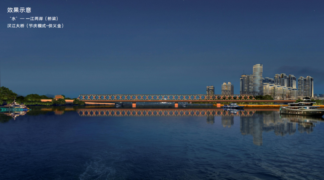汉江大秀演艺,将用灯光作笔,以江水为墨,在汉江大桥、长虹大桥两座大桥的框架下,讲千年传奇,秀今日辉煌,桥连古今篇章;通过光影艺术串联汉江两岸、古城城墙与护城河,构建“一江两岸,古今对话”的夜游版图。