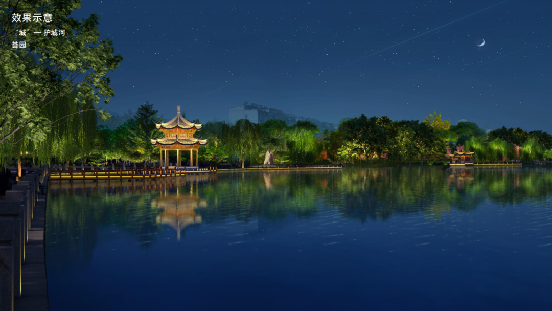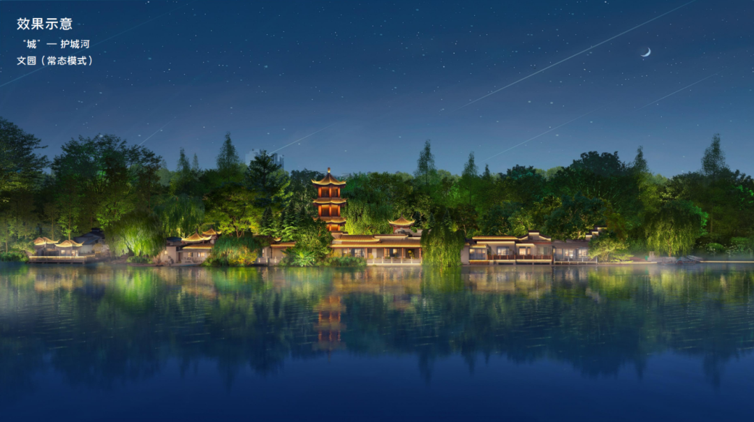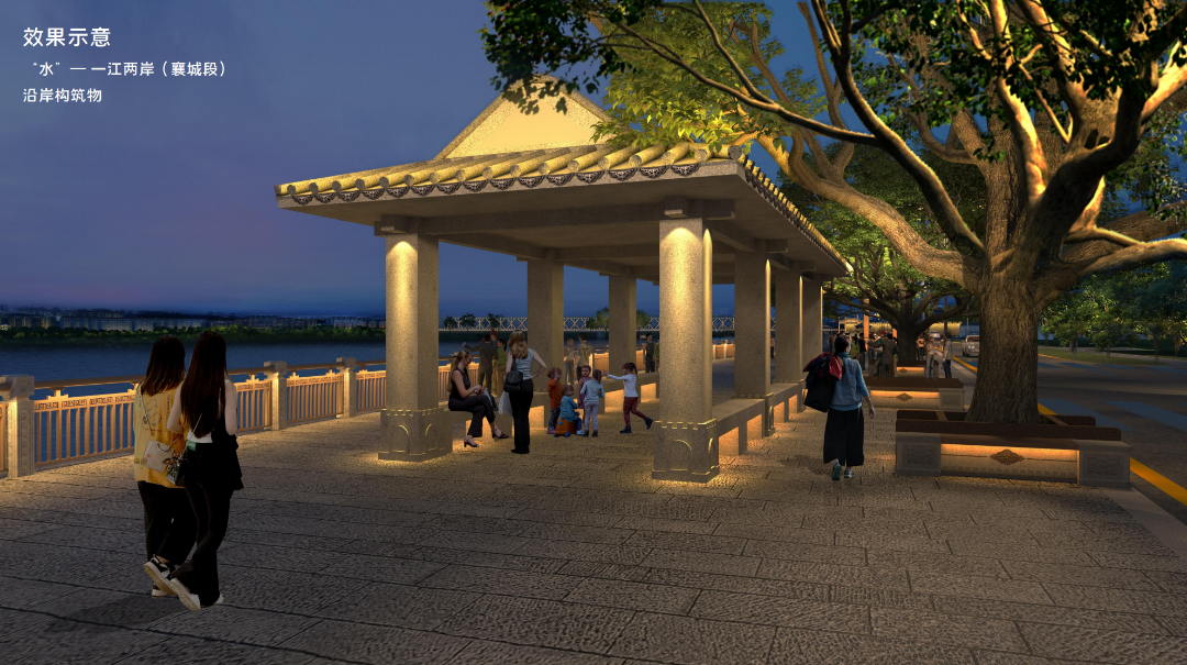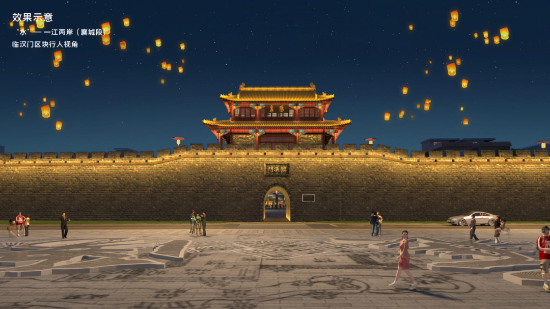 其中,通过改善和提升现有建筑及两岸生态景观,以文化体验为主线,构建展现襄阳历史文化底蕴的生动场景,提升文荟园艺术风貌及沿岸的护城河风貌。襄阳城墙是体验城防军事的主要空间与线路,为便于游览,在符合文保要求的大前提下,进行东西城门联通,打造环城墙日夜特色游览体验。