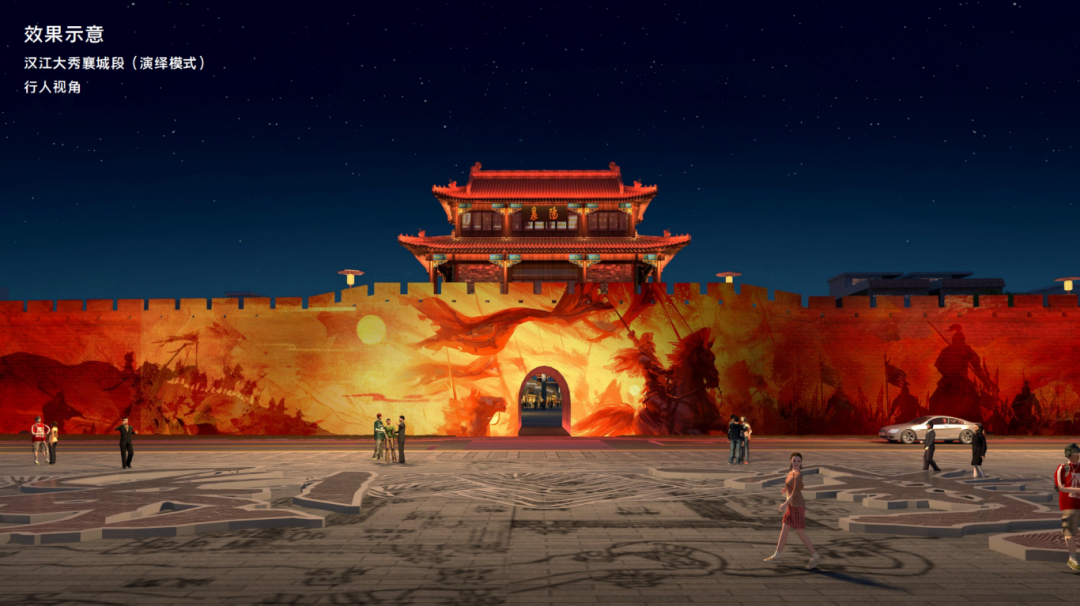 此外,在仲宣楼及四周城墙空间,通过光影亮化进行体验提升,同时设置打卡体验点,突出其艺术性和纪念性。通过远处岘山的局部点亮,勾勒山体优美线条,与古城、汉江交相辉映。
