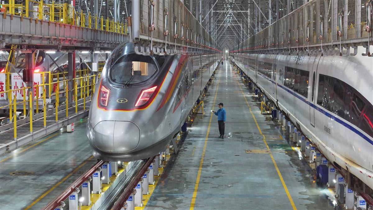 9月27日深夜,襄阳动车运用所工作人员在检修库内对襄荆高铁即将首发的“复兴号”列车做最后的检查。(湖北日报全媒记者 陈迹 摄)