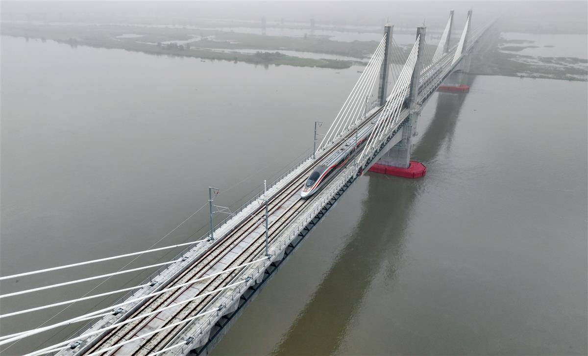 9月28日上午11点40,从襄阳东站发车的襄荆高铁首趟列车在蒙蒙细雨中驶过宜城汉江大桥。(湖北日报全媒记者 陈迹 摄)