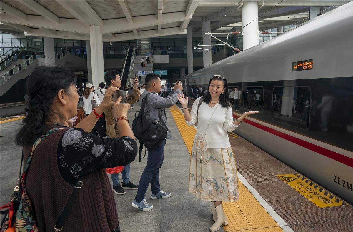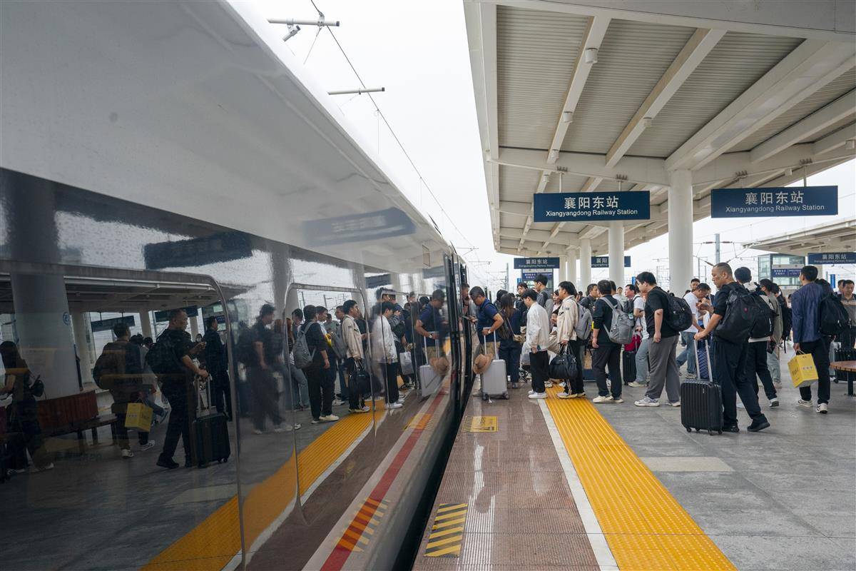 乘坐高铁环线的旅客们在襄阳东站拍照留念