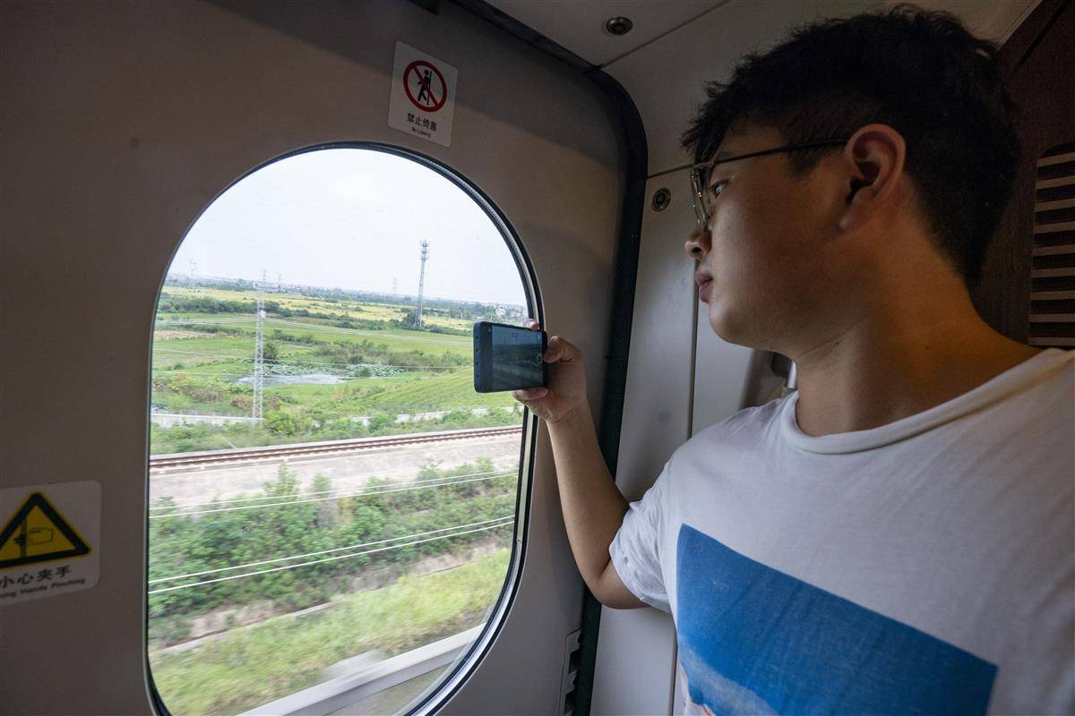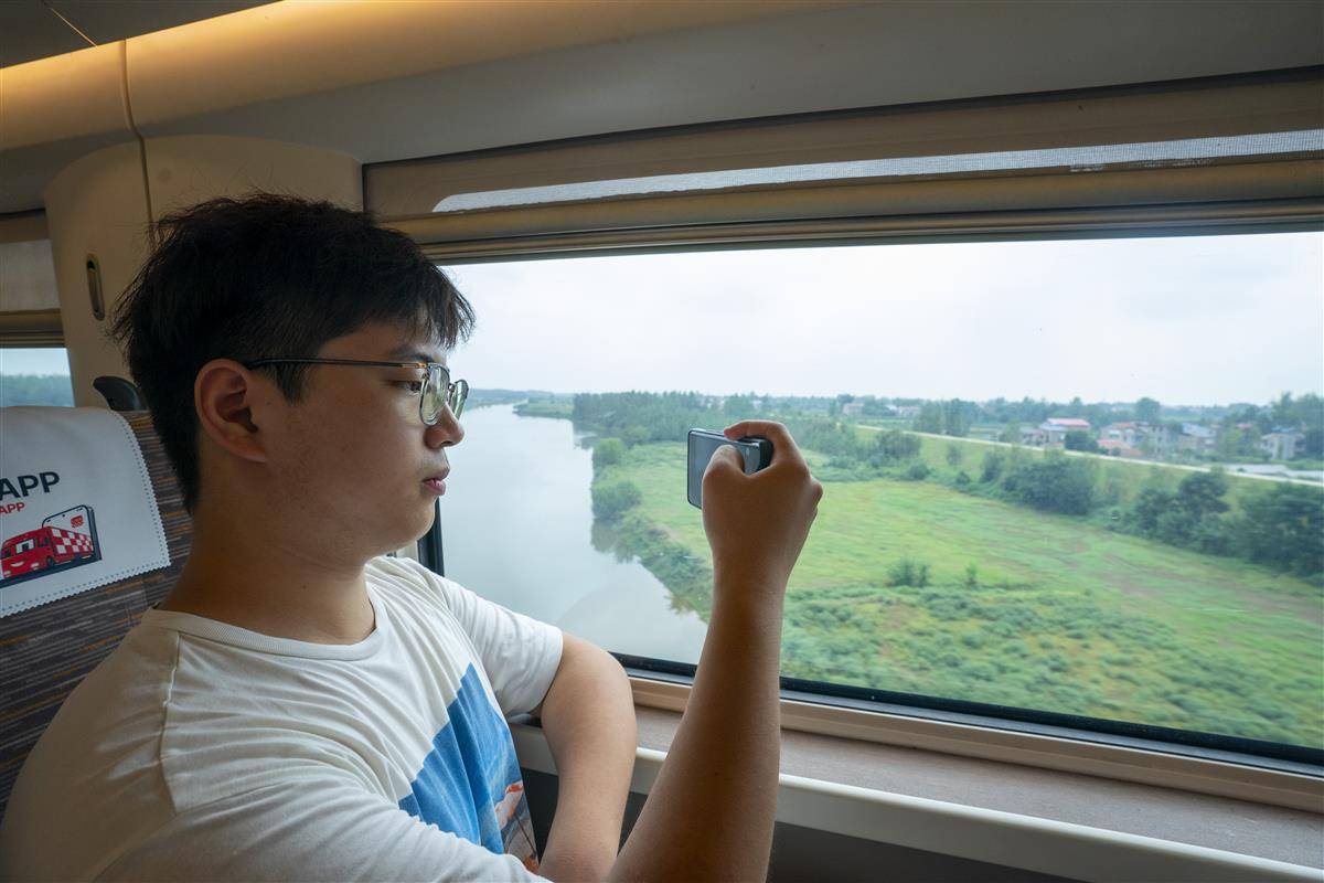 9月28日,飞驰的G6769次高铁列车上,几位“铁路迷”一边拍摄沿途景色,一边查看列车运行轨迹。当日,襄荆高铁的开通运营,标志着我省首个高铁环线正式形成。高铁环线联结武汉、襄阳、荆门、荆州等8个市州,极大方便沿线群众生产生活。襄荆高铁的开通运营,将促进汉襄宜“1小时高铁圈”加快形成。襄阳至荆门高铁是国家“八纵八横”高速铁路规划网呼南通道的重要组成部分,正线长度116.23公里,总投资188.32亿元,全线设襄阳东站、宜城站、双河西站、荆门西站4座车站。开通后,与荆荆高铁、汉宜高铁、汉十高铁相衔接,将进一步优化区域路网结构和功能,促进湖北经济社会高质量发展。(湖北日报全媒记者 魏铼 摄)