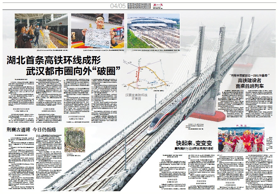 至此,湖北首条高铁环线成形:襄荆高铁、荆荆高铁、汉宜铁路荆州至汉口段、汉十高铁汉口至襄阳东站段,形成一个闭环,串联武汉、孝感、随州、襄阳、荆门、荆州、潜江、仙桃、天门九市,旅行全程约3.5小时。
