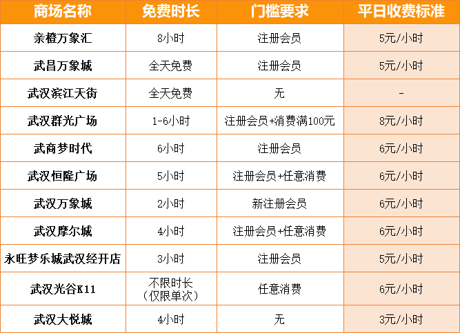 武汉群光广场:注册会员并在店内消费满100元,可免费停车1小时,最高可免6小时停车费。