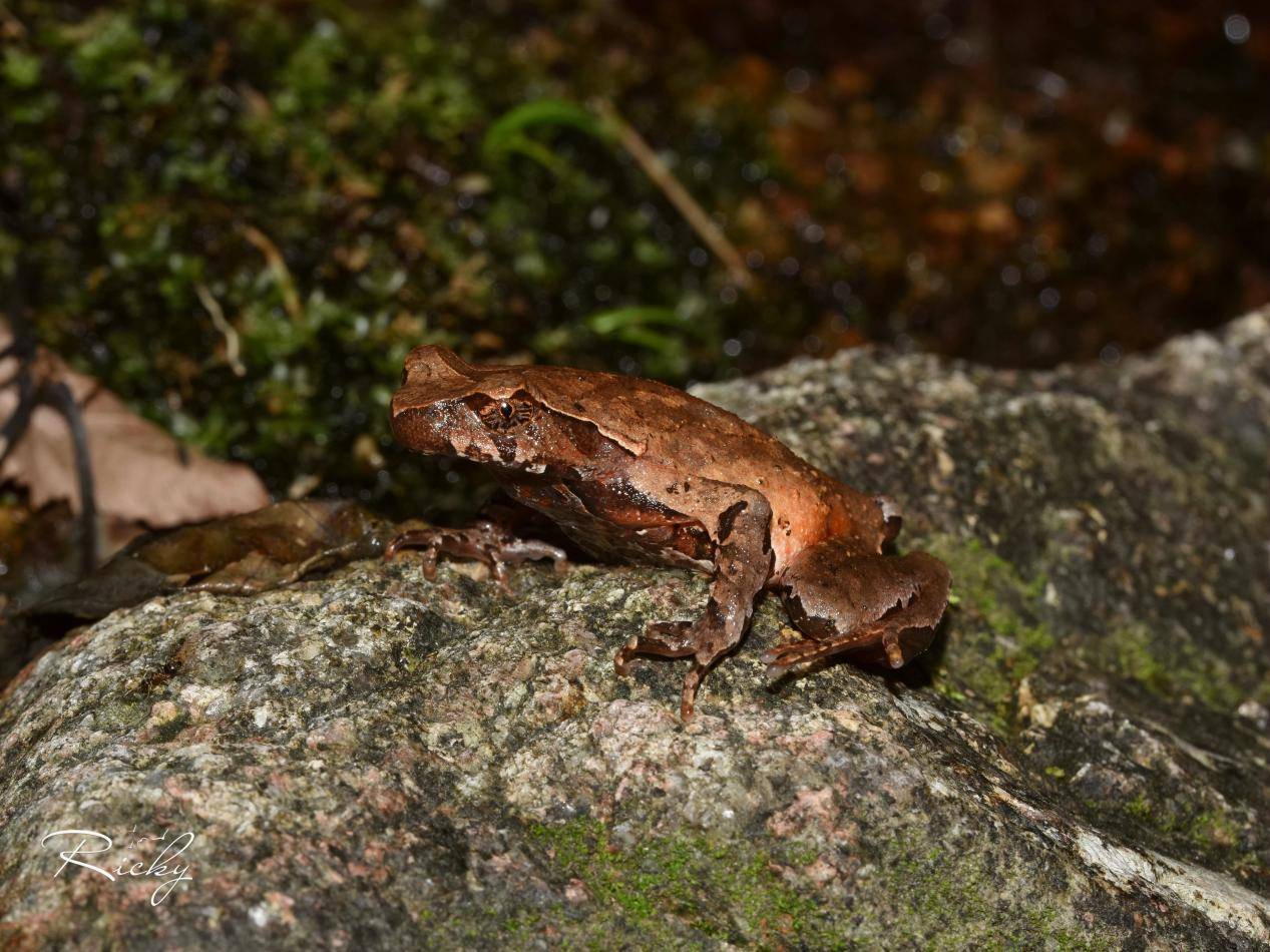 据了解,大老岭角蟾栖息地位于海拔1380-1650米的山地亚热带针阔混交林下的溪流中,周边有草丛,繁殖季节为5月,成年角蟾体型中等(雄性SVL≥49.9mm,雌性最大个体不超过60.0mm)。该物种存在明显的雌雄异型现象,雄性具有单咽下内声囊,在第一、第二指的基部具有明显的灰色婚垫,其上着生粗壮而密集的黑色婚刺;雄性具宽的趾侧缘膜,而雌性具有较窄的趾侧缘膜。雄性生活时背部呈橄榄绿色,雌性呈现为棕色;两眼之间有倒三角形褐色斑点;背部有V形脊,有褐色斑点,股、胫背面有横带;上下唇有数条深褐色和白色纵纹;后肢腹面呈鲜艳的红色,有多数白色颗粒。