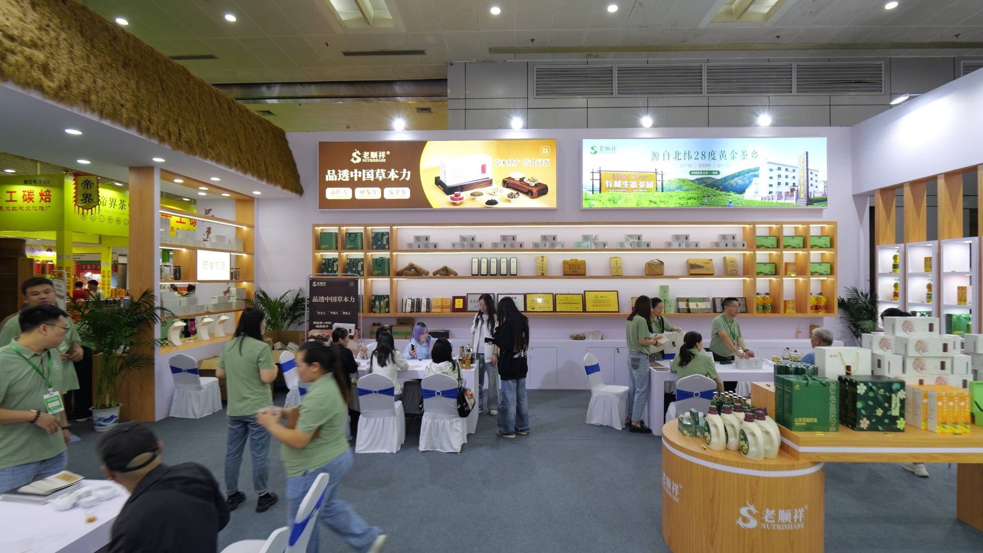 在本届茶博会上,老顺祥科技集团精心打造极具特色的品牌展位,巧妙融合传统与现代风格,茅草屋顶与木质货架彰显茶文化底蕴,白色立体结构与LED大屏体现科技感,整体营造出既现代感又充满生命力的茶体验空间。