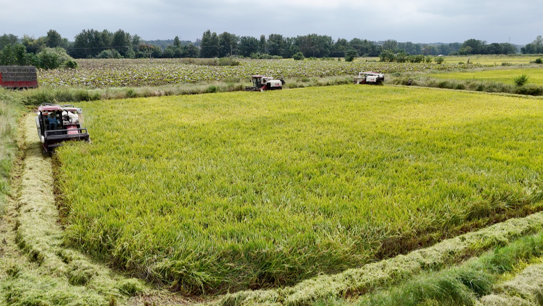 “一台收割机一个小时能割七八亩中稻,一天50亩不在话下,今天计划收割200亩中稻。看到金灿灿的稻谷,我们越干越有劲。”种粮大户蔡军民的脸上,满是丰收的喜悦。