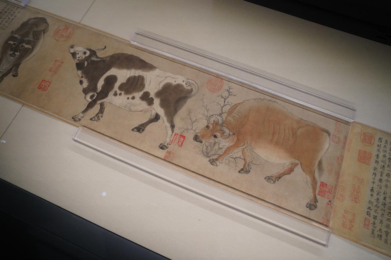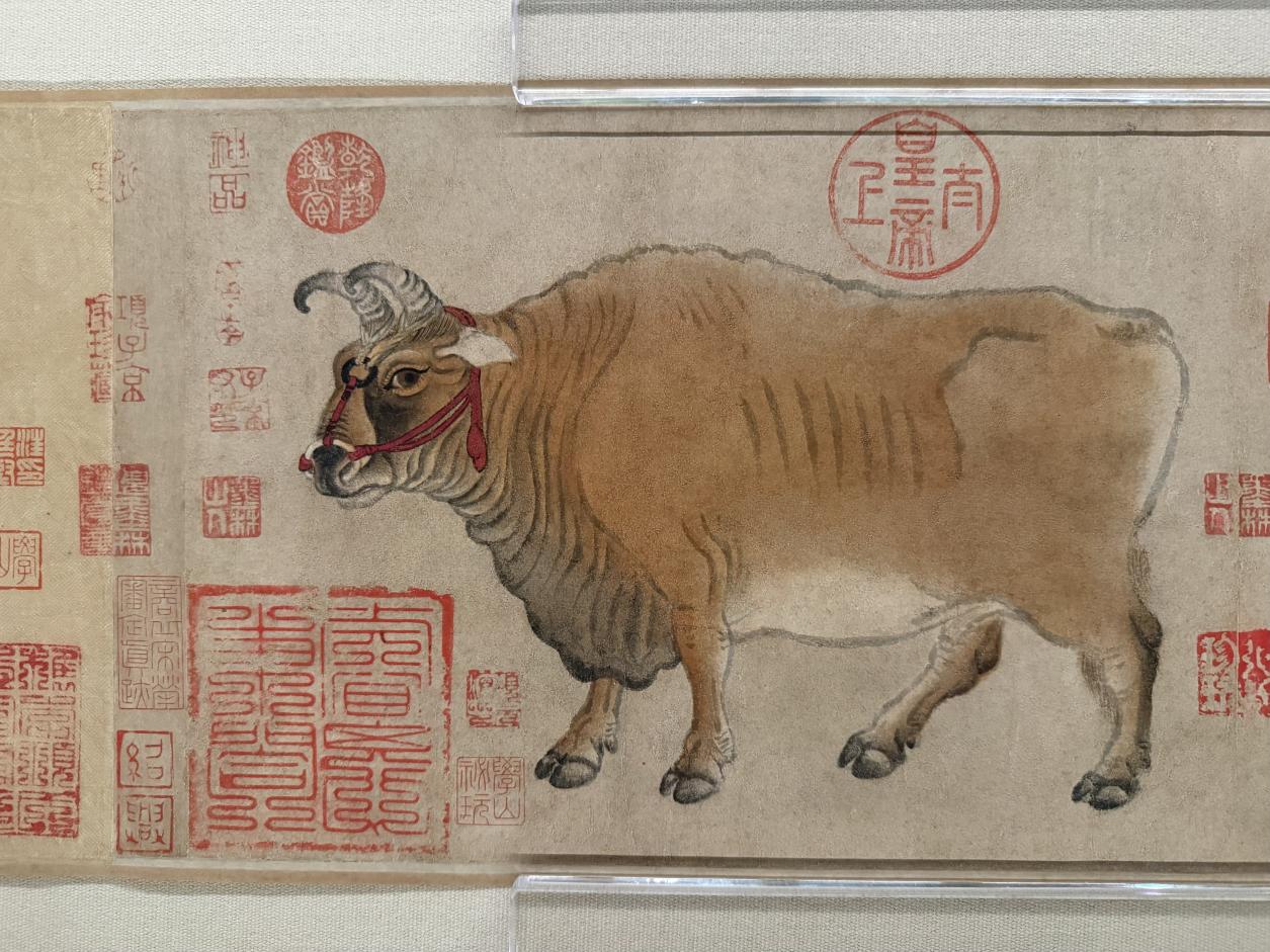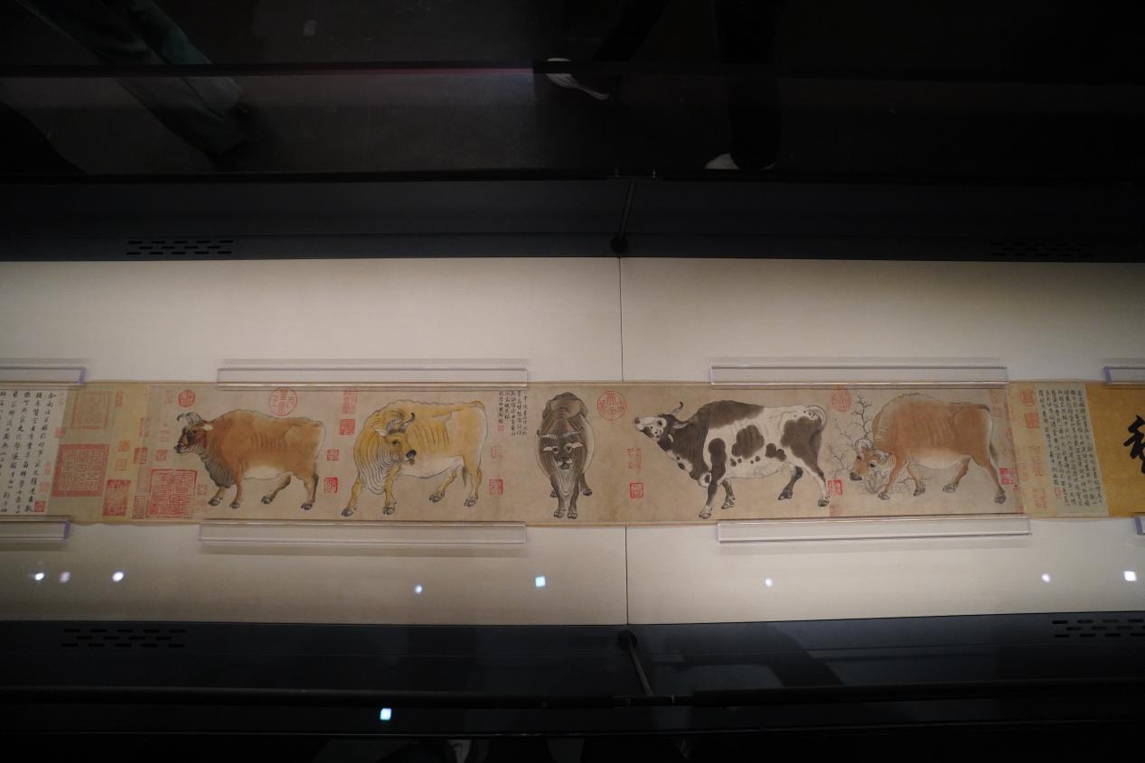 图中画牛五头,形象姿态各异,或依棘搔痒,或昂首低鸣,或悠然信步,或回首顾盼。最后一黄牛头上还束有一个颇为讲究的红色“络头”。此卷是目前所见存世最早的纸本绘画。1958年,此卷由国务院拨款从香港购回。入藏故宫博物院时,已是创痕累累。后经孙承枝等专家修复,再获新生。