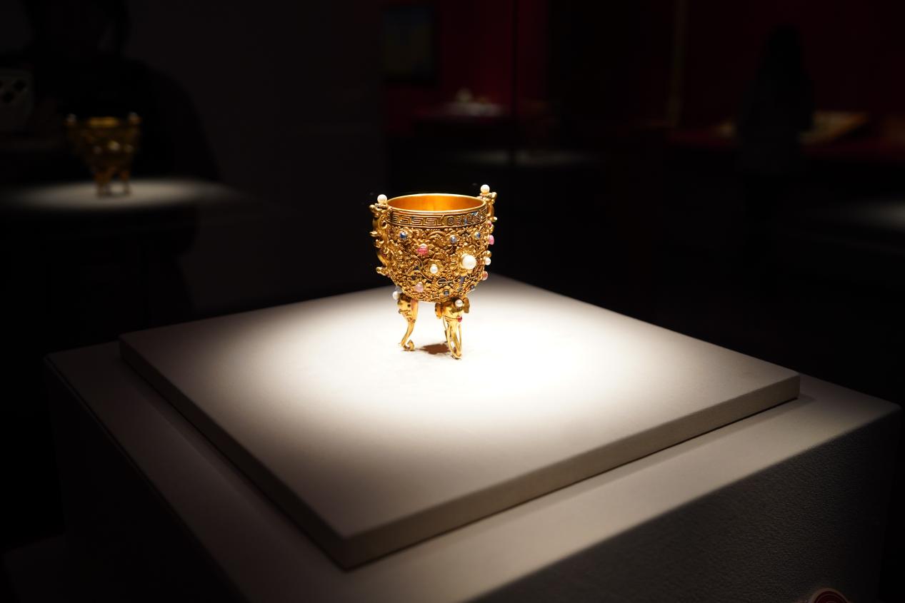 金杯以八成金制成,直口,夔龙耳,象首式三足,杯身錾刻缠枝宝相花,镶嵌红、蓝宝石及珍珠为花蕊。金杯口沿一面錾刻篆书“金瓯永固”,另一面錾刻篆书“乾隆年制”。金瓯永固杯不仅是清宫元旦开笔的御用之器,更成为风调雨顺、国运昌盛的象征。