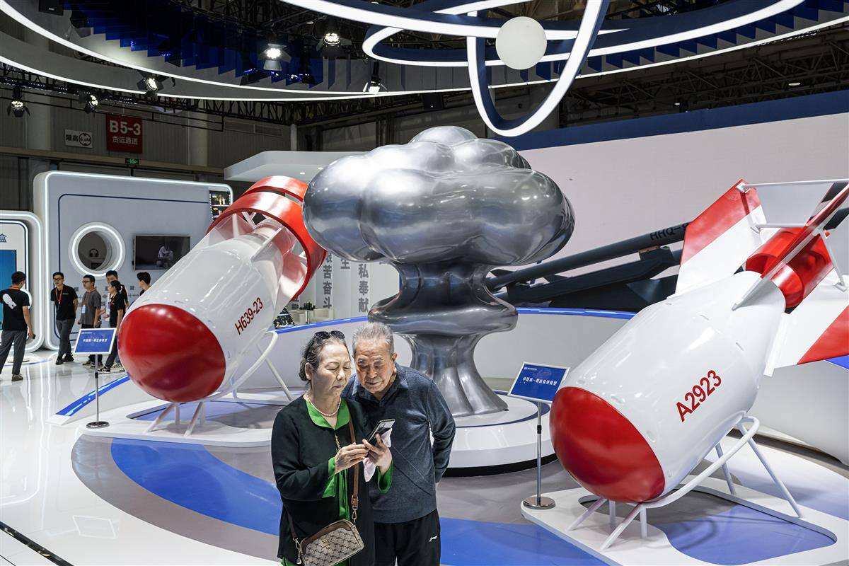 9月29日,中国第一颗核航弹模型和中国第一颗氢弹模型亮相首届国防军工文博会。(湖北日报全媒记者 任勇 摄)