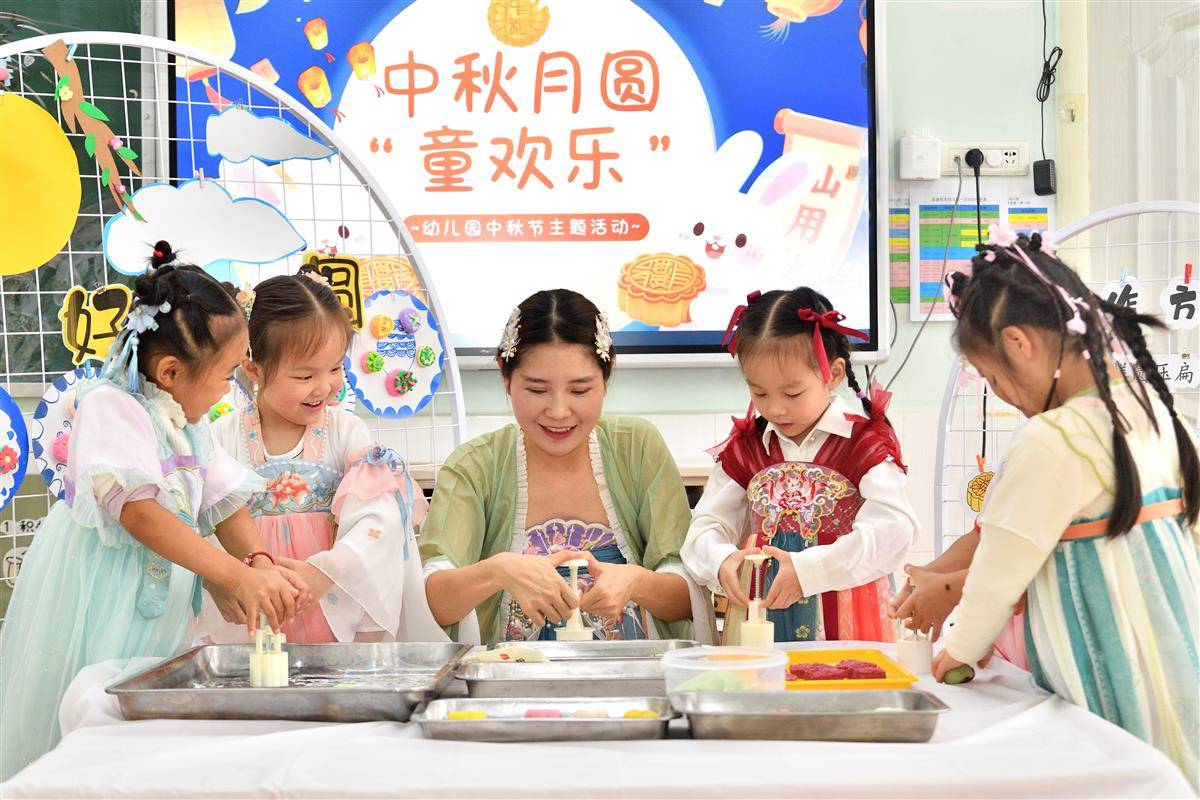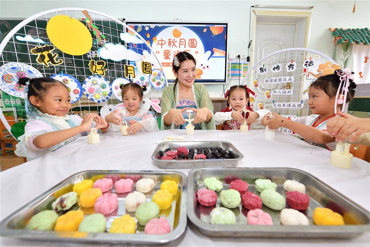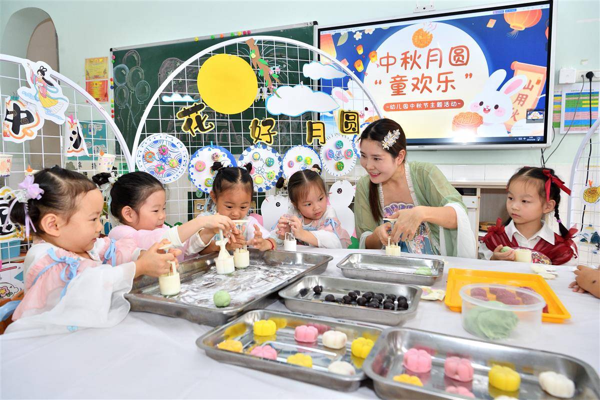 9月28日,保康县县直机关幼儿园的小朋友在老师的指导下制作月饼。当日,在中秋节来临之际,保康县县直机关幼儿园开展“中秋月圆‘童’欢乐”主题活动,孩子们在老师的指导下做月饼、猜灯谜,感受传统民俗的魅力。(视界网 杨韬 余夕雯 摄)