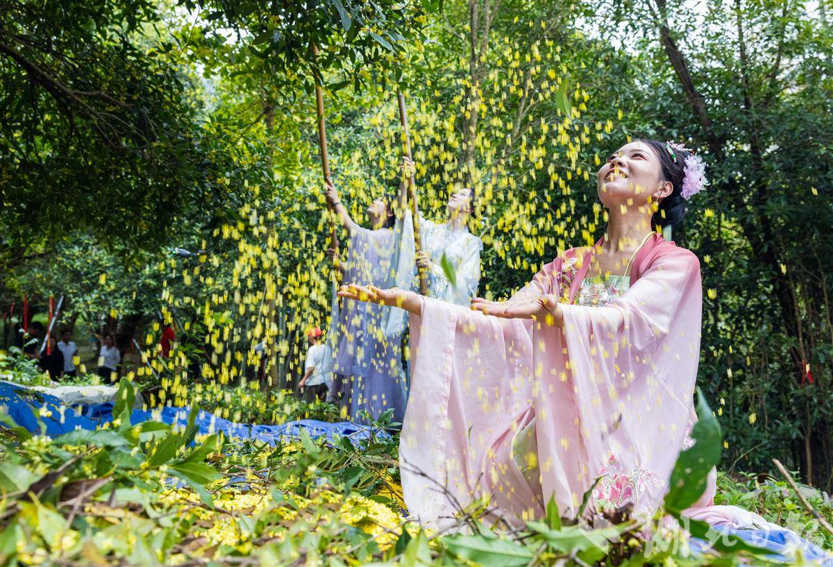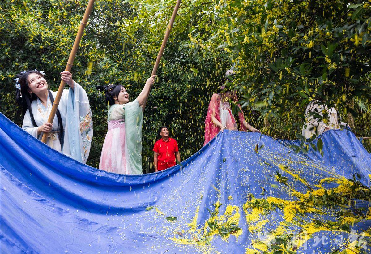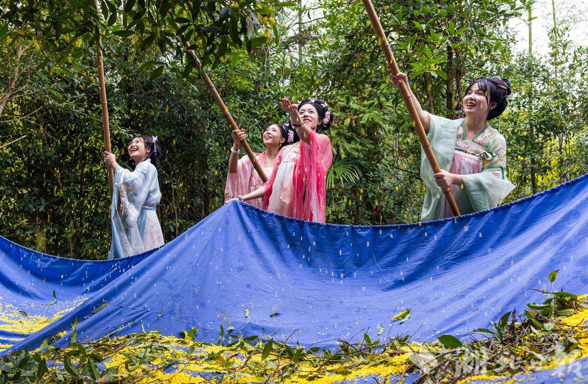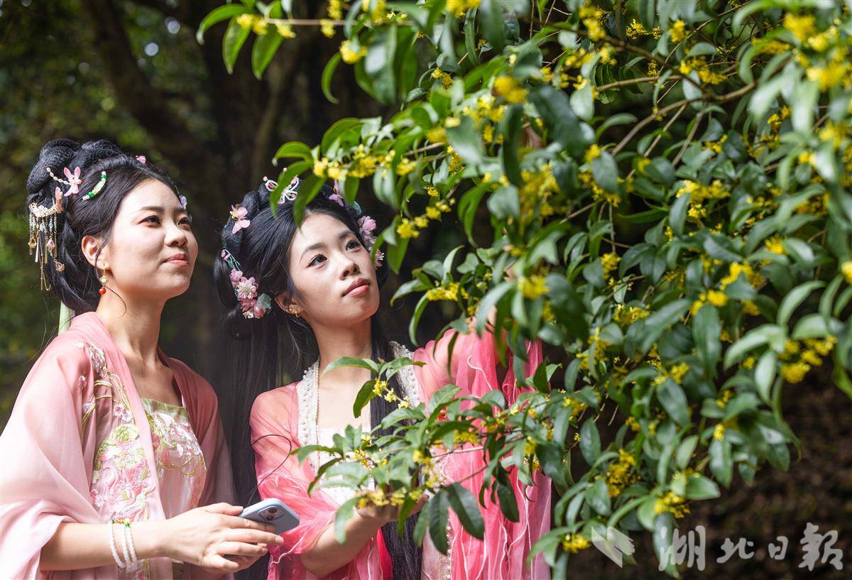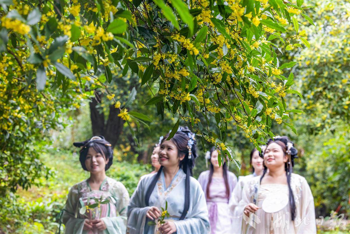 金秋时节,“中国桂花之乡”咸宁迎来赏桂好时节。9月29日,咸安区桂花镇桂花源风景区内,古桂群落枝繁叶茂、金桂满缀,游客穿梭其间赏桂闻香、体验打桂花,尽享秋日雅致。