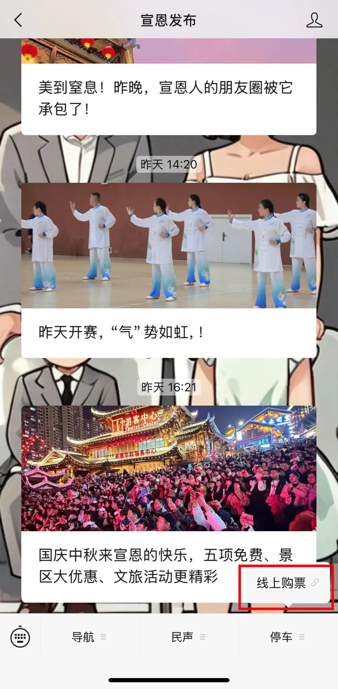 进入公众号,在底部菜单栏找到并点击“线上购票”按钮。