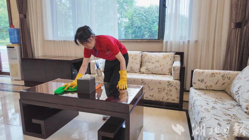 依托崇阳县“天然氧吧”的生态优势,这些民宿不仅为游客提供歇脚之处,更营造出一种沉浸式的自然生活体验。与此同时,各大星级酒店也已进入假期接待的备战状态。走进咸宁崇阳华美达酒店,保洁人员正手持清洁工具,细致擦拭窗台、全面消毒各个角落。大堂灯光温暖明亮,环境整洁有序,客房内设施齐备,床品柔软舒适,窗外绿意扑面,整体氛围温馨而惬意,静待游客到来。