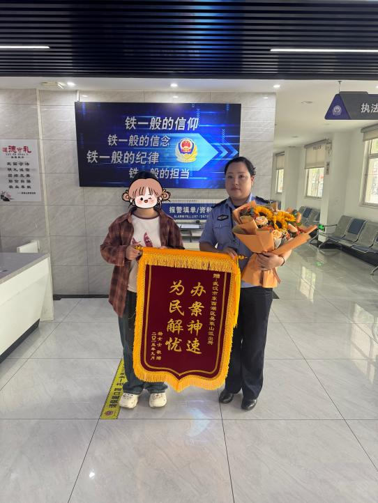 26日上午,杨女士携带着一面锦旗和一捧鲜花,专程来到派出所内,将其亲手送给辅警洪玲以及吴家山街派出所,对民警辅警火速为其挽回损失,再次连连感谢。
