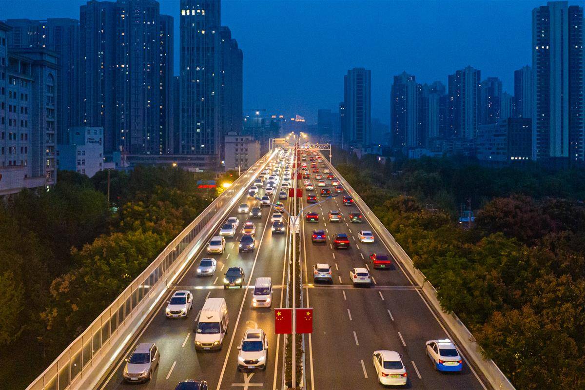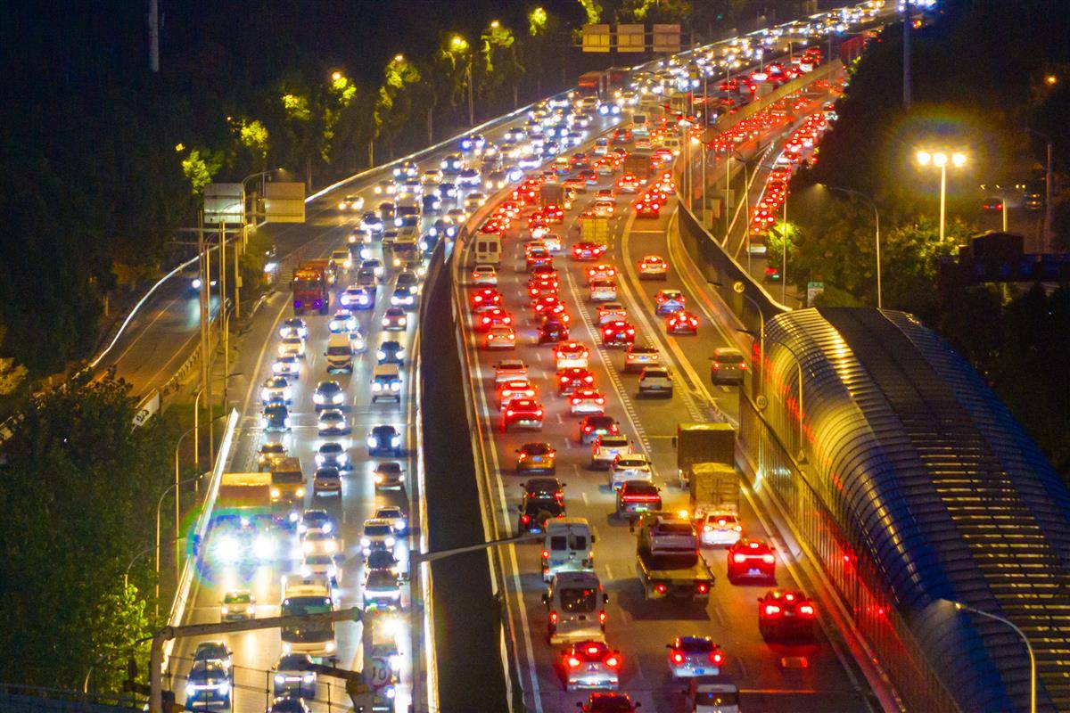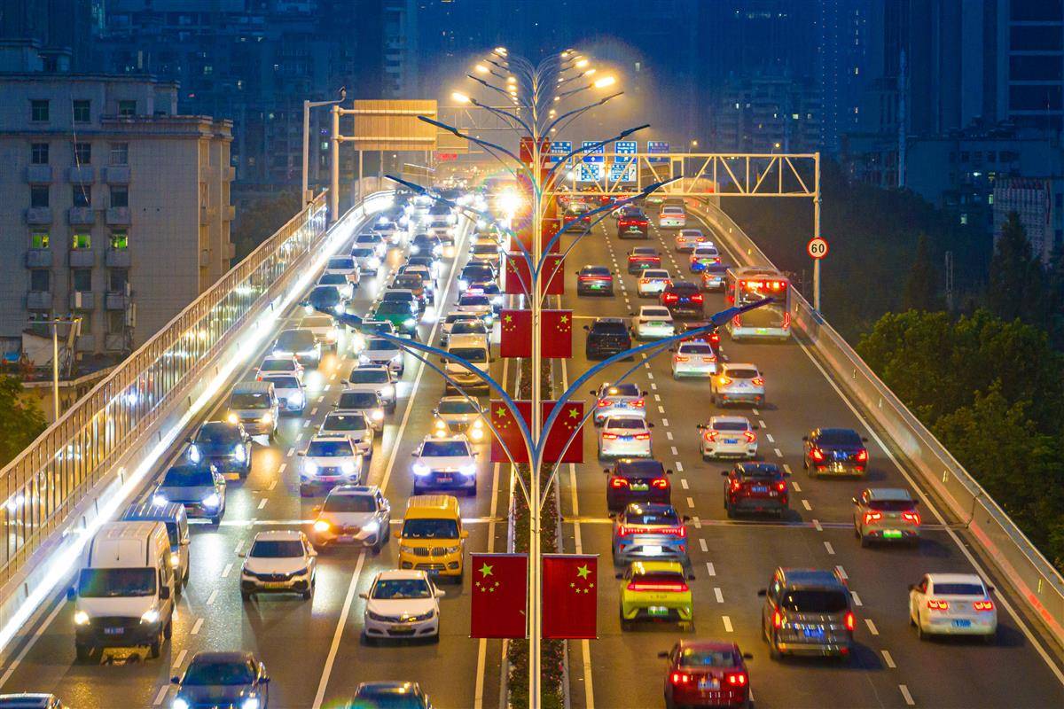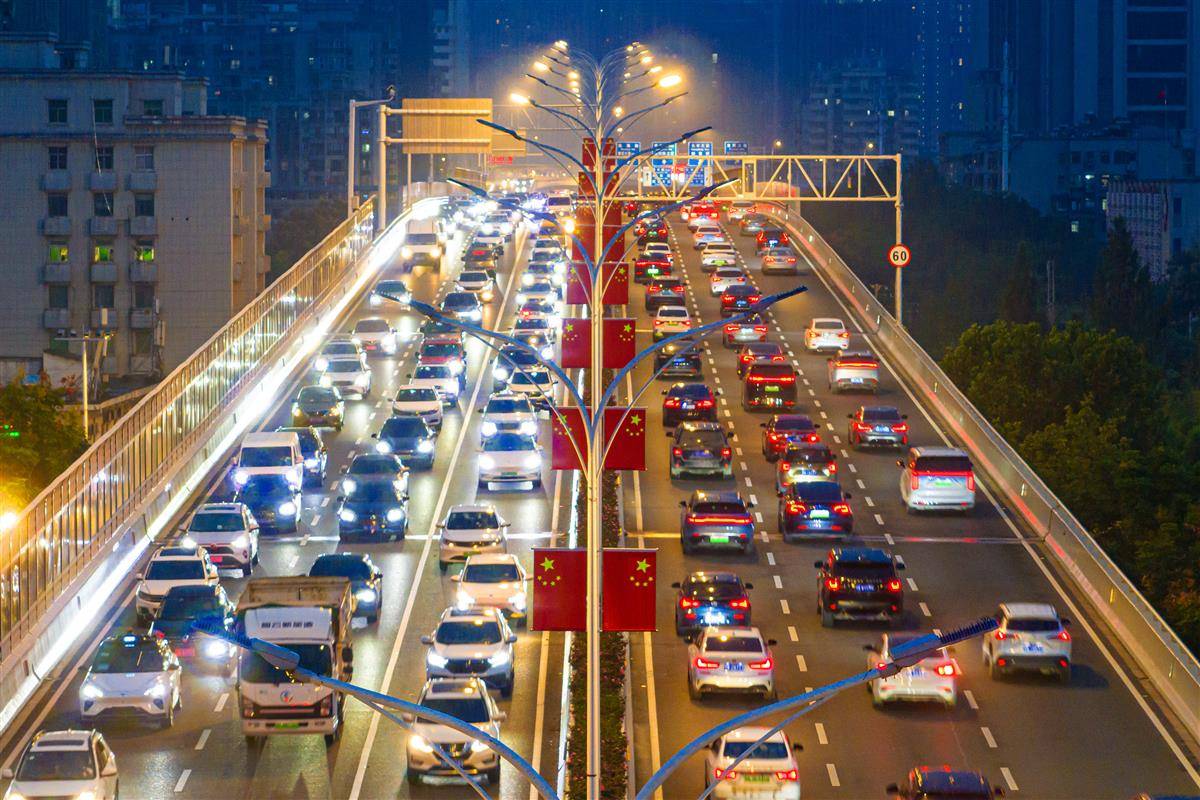 9月30日晚,2025国庆中秋长假即将开启,武汉迎来客流出城高峰,武汉常青路高架和三环线常青立交车流骤增,排队缓行。据武汉交通运输部门预测,9月30日至10月8日,武汉高速收费站总流量将达1135.4万台次,日均通行量126.2万台次——这一数据较节前平日增长96%,较2024年同期增长3.5%,创近年同期新高。(湖北日报全媒记者 任勇 摄)