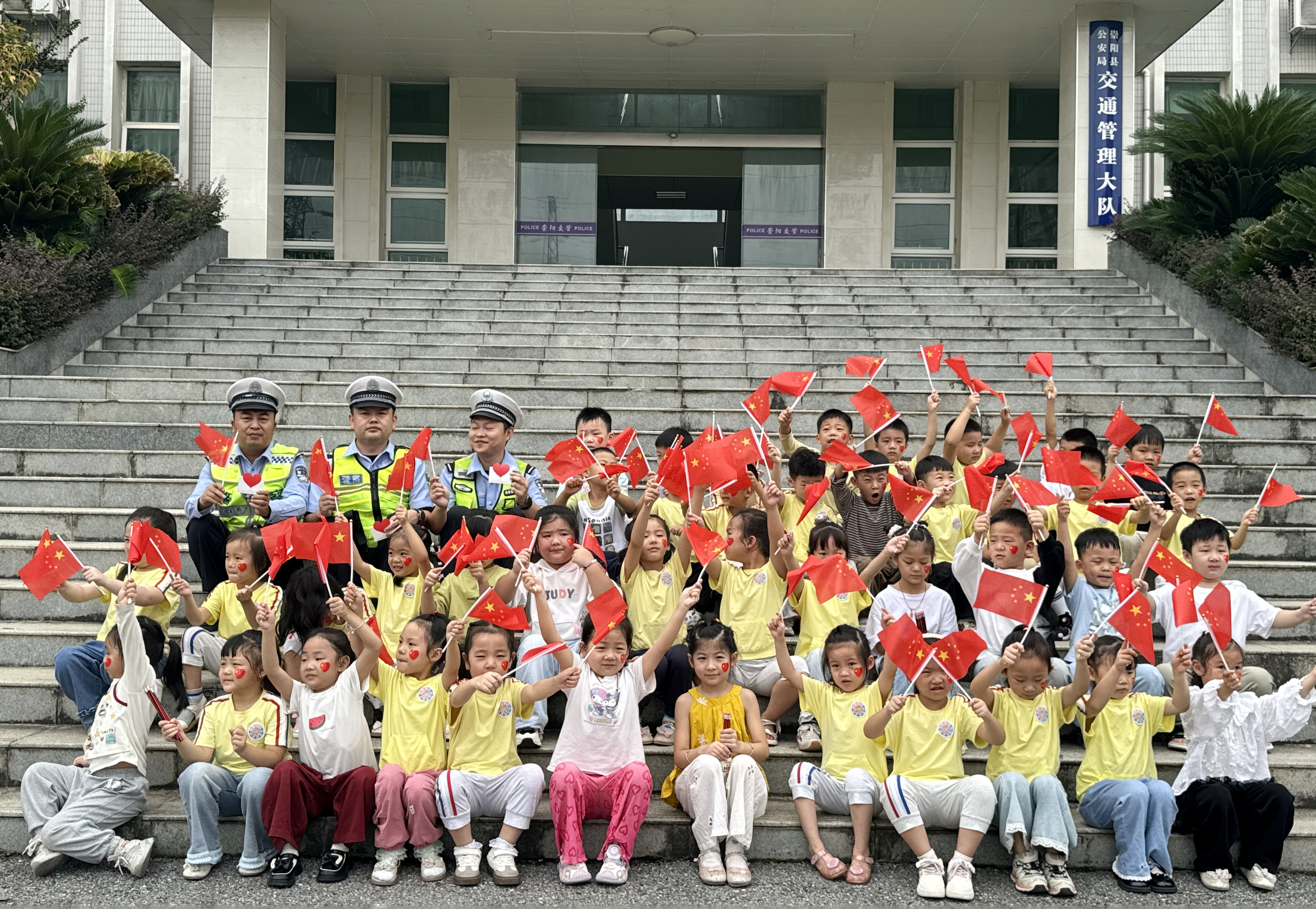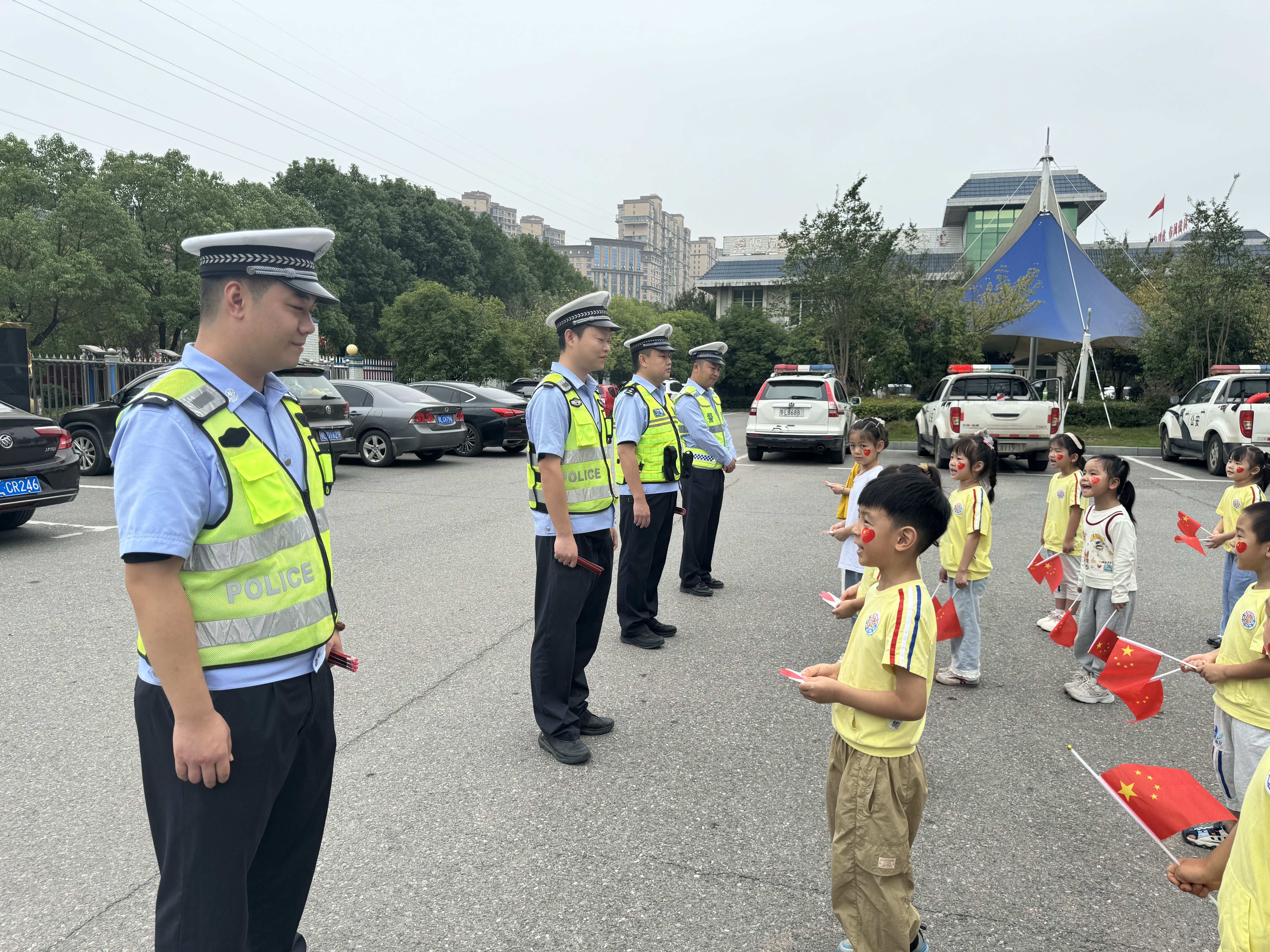 上午9时,身着整齐园服的孩子们,手举鲜艳的五星红旗,紧握着亲手绘制的祝福卡,在老师们的带领下走进警营。