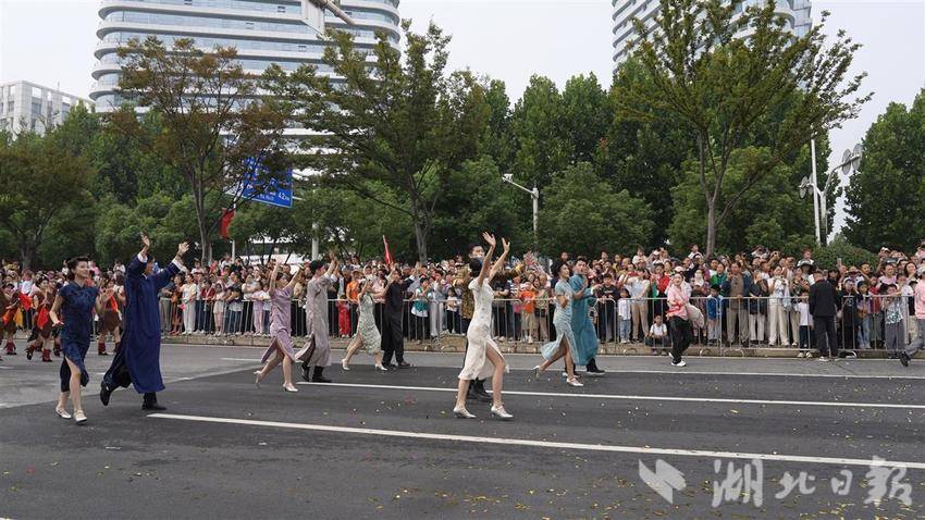 《洪湖赤卫队》《沂蒙山》《红色娘子军》等经典剧目片段依次上演,再现革命文艺的峥嵘岁月。“动漫萌宠”花车则充满童趣,长江江豚“豚宝”、本土IP“蒜鸟家族”与全息投影的国漫角色互动,身后80名儿童coser组成“国漫小队”,传递着文化传承的生机。