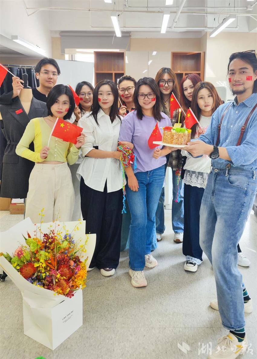 同事们为朱仕(右一)庆祝生日。服装培训师朱仕出生于1982年10月1日,所以用“十”“一”组成“仕”来当作自己的名字。“能和祖国同一天生日,我万分荣幸和自豪”朱仕说,“愿祖国的发展如华服般璀璨夺目,愿人民的生活如丝绸般幸福绵长。”(通讯员 林思嘉 摄)