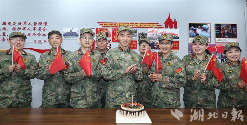10月1日,武汉市青山区人武部刘庆(左5)36岁生日,战友们齐唱生日快乐送上祝福。(湖北日报全媒记者 张鸿 通讯员 万腊华 徐杨 摄)