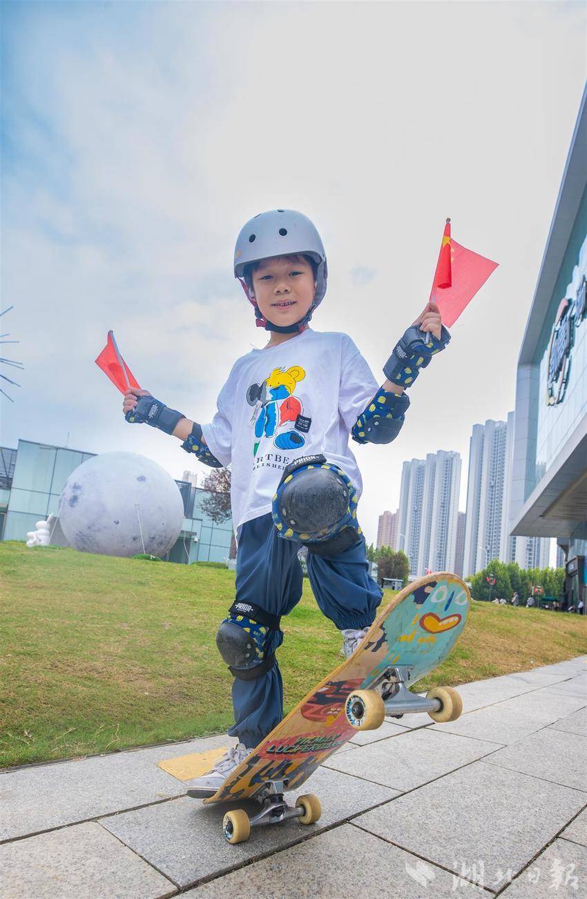 硚口区一家商场的广场上,8岁的汪宇泽正用滑板演绎着速度与激情,以此度过自己的生日。他脚踏滑板,如雏鹰展翅,轮子划过地面的“唰唰”声,仿佛为这特别的日子奏响轻快旋律。跃起、旋转、落地,汗水浸湿头发,他却笑得格外灿烂:“每年生日,满街都是国旗,这感觉真棒!我要滑得更好,像祖国一样越来越强!”