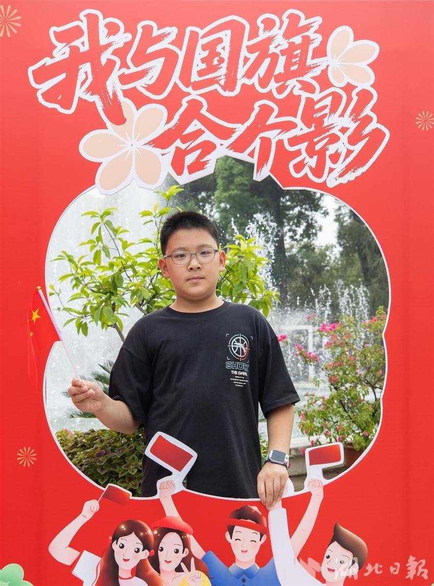 赵朗程,2013年10月1日出生,就读水果湖二小六年级。国庆节这天,他来到了爸爸妈妈的母校——华中师范大学,在鲜艳的国旗下留下了一张12岁的生日照。他的愿望就是长大后也能来到这里学习,将来报效祖国。(湖北日报全媒记者 柯皓 摄)