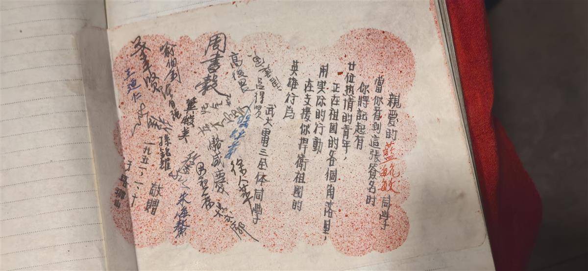 “亲爱的兰毓敏同学,当你看到这张签名时,你将记起,有20位热情的青年,正在祖国的各个角落里,用实际的行动支援你捍卫祖国的英雄行为。武大电三全体同学。”