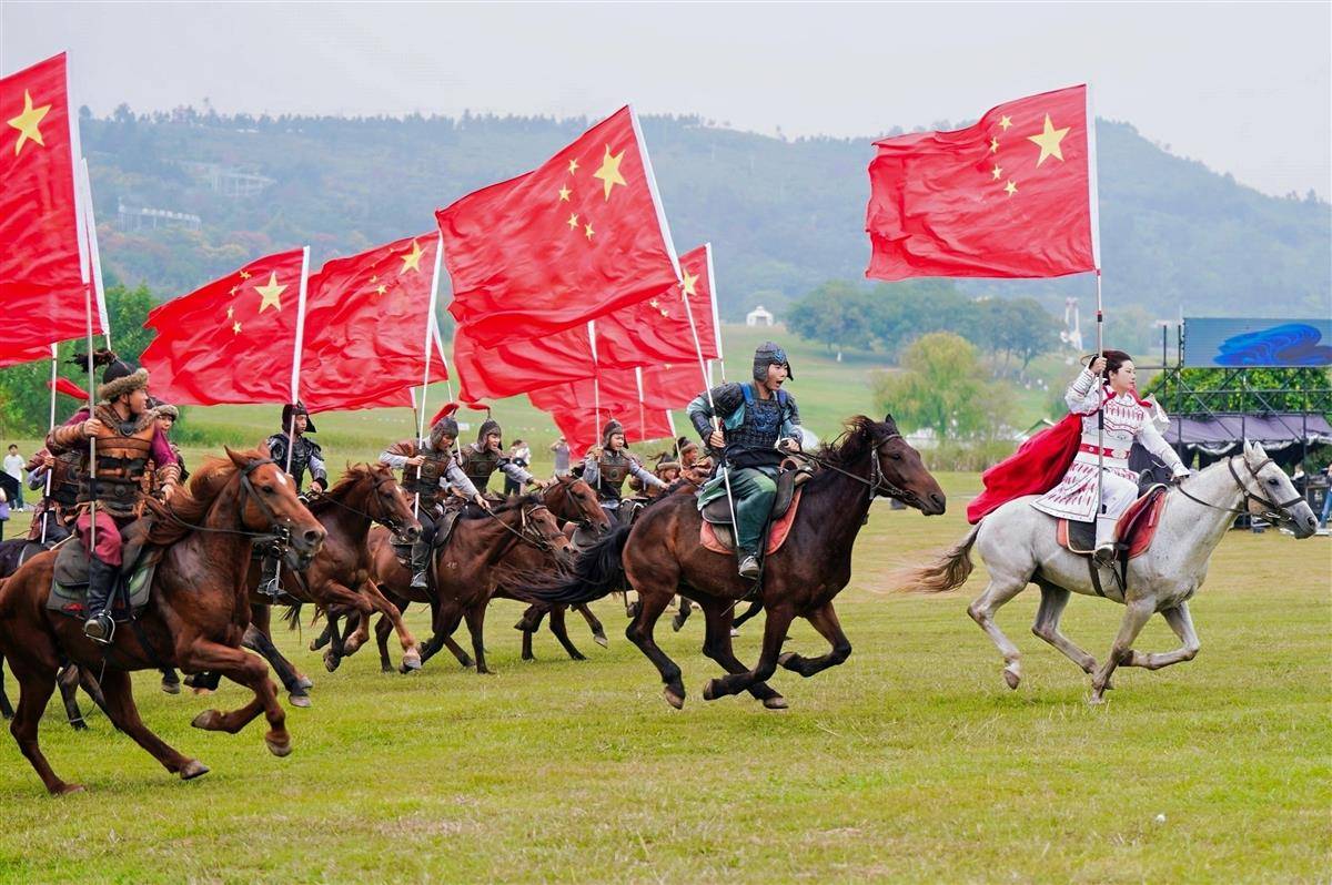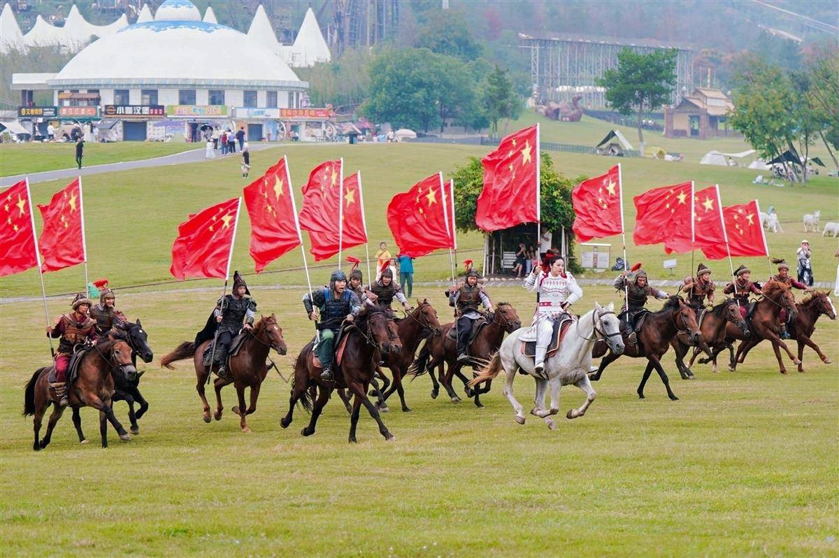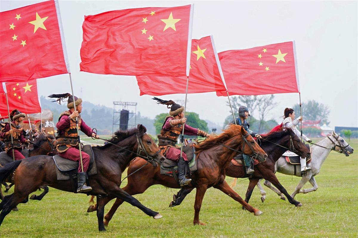 马蹄声响,国旗飘扬!10月1日,在武汉市黄陂区木兰草原,身着古装的演员扮成花木兰,与十余名“将士”手持国旗策马扬鞭,庆祝新中国华诞。(湖北日报全媒记者 任勇 黄磊 通讯员 黄宣 李阳 摄)