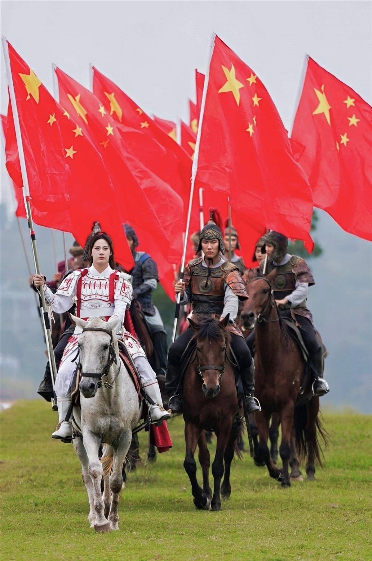 10月1日,在武汉市黄陂区木兰草原,身着古装的演员扮成花木兰,与十余名“将士”手持国旗策马扬鞭,庆祝新中国华诞。(湖北日报全媒记者 任勇 黄磊 通讯员 黄宣 李阳 摄)