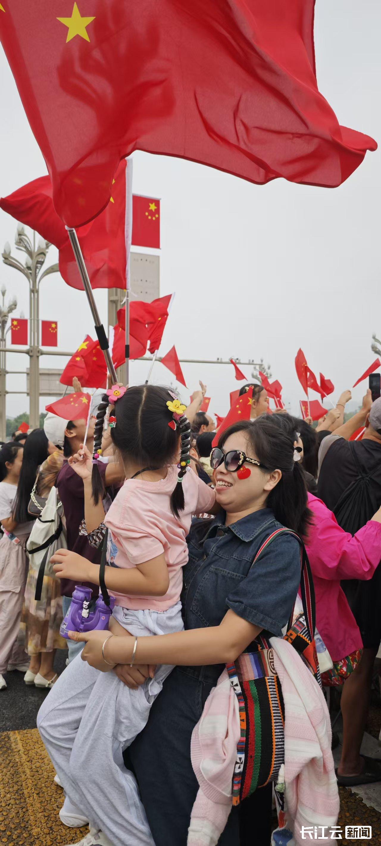 一位把女儿抱起来看花车的妈妈感叹:“在国庆这个特别的日子,这场景真让人眼眶发热!”