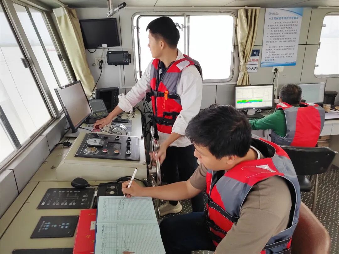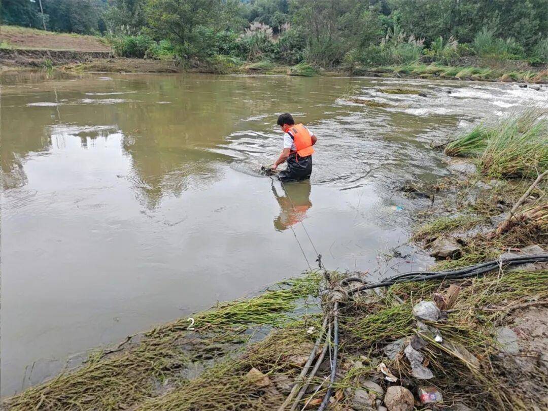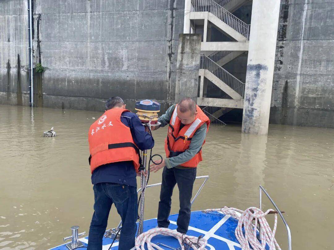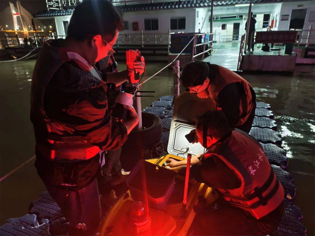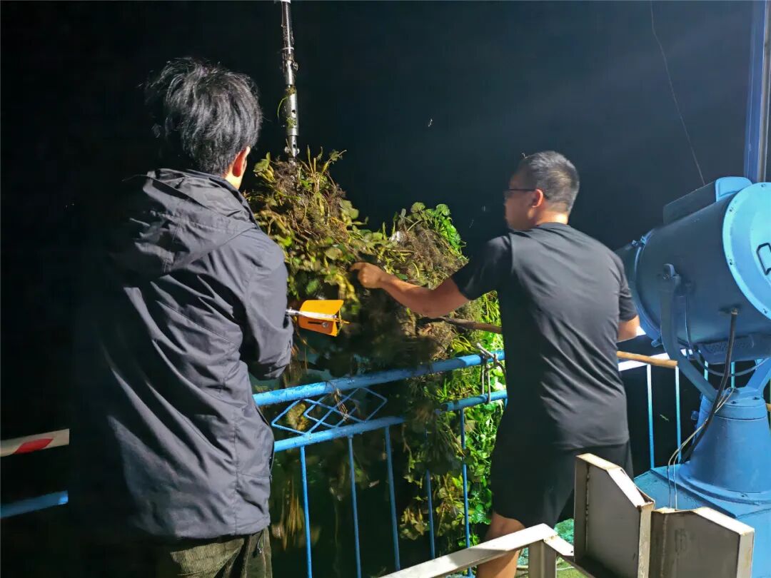 郭滩水文站凌晨测流,测验人员清理铅鱼上的漂浮物。