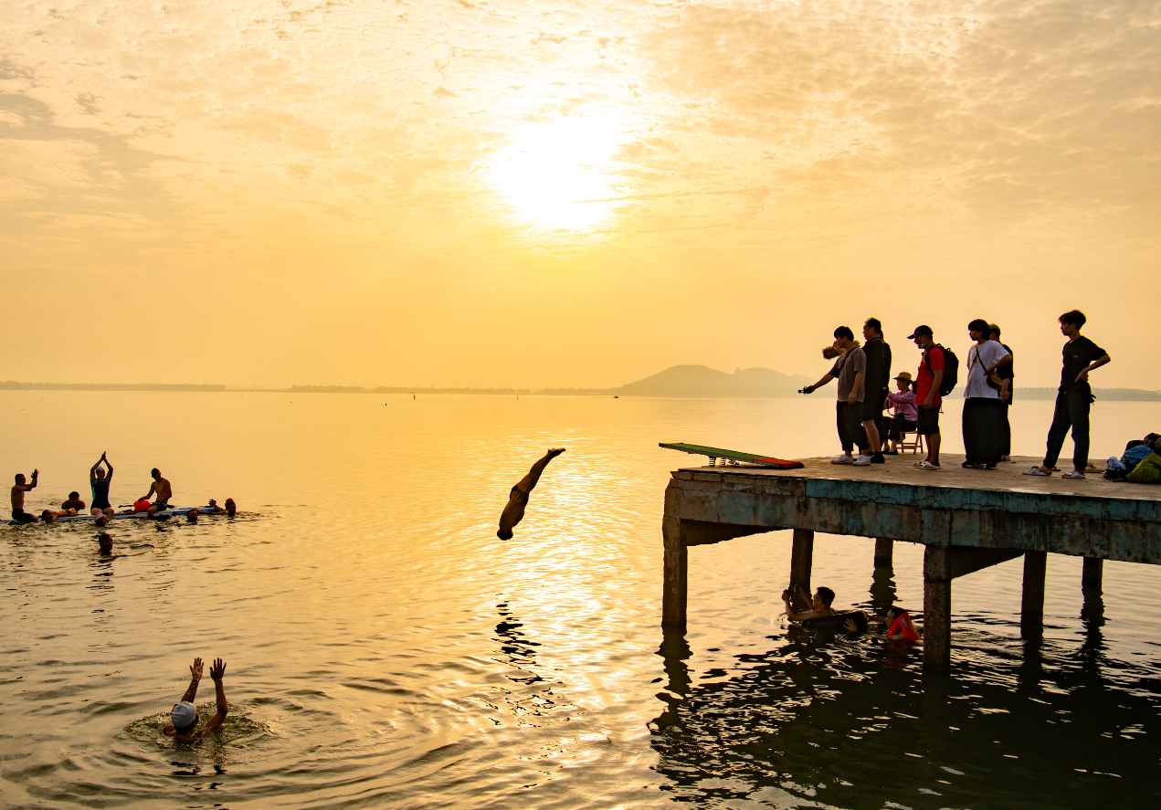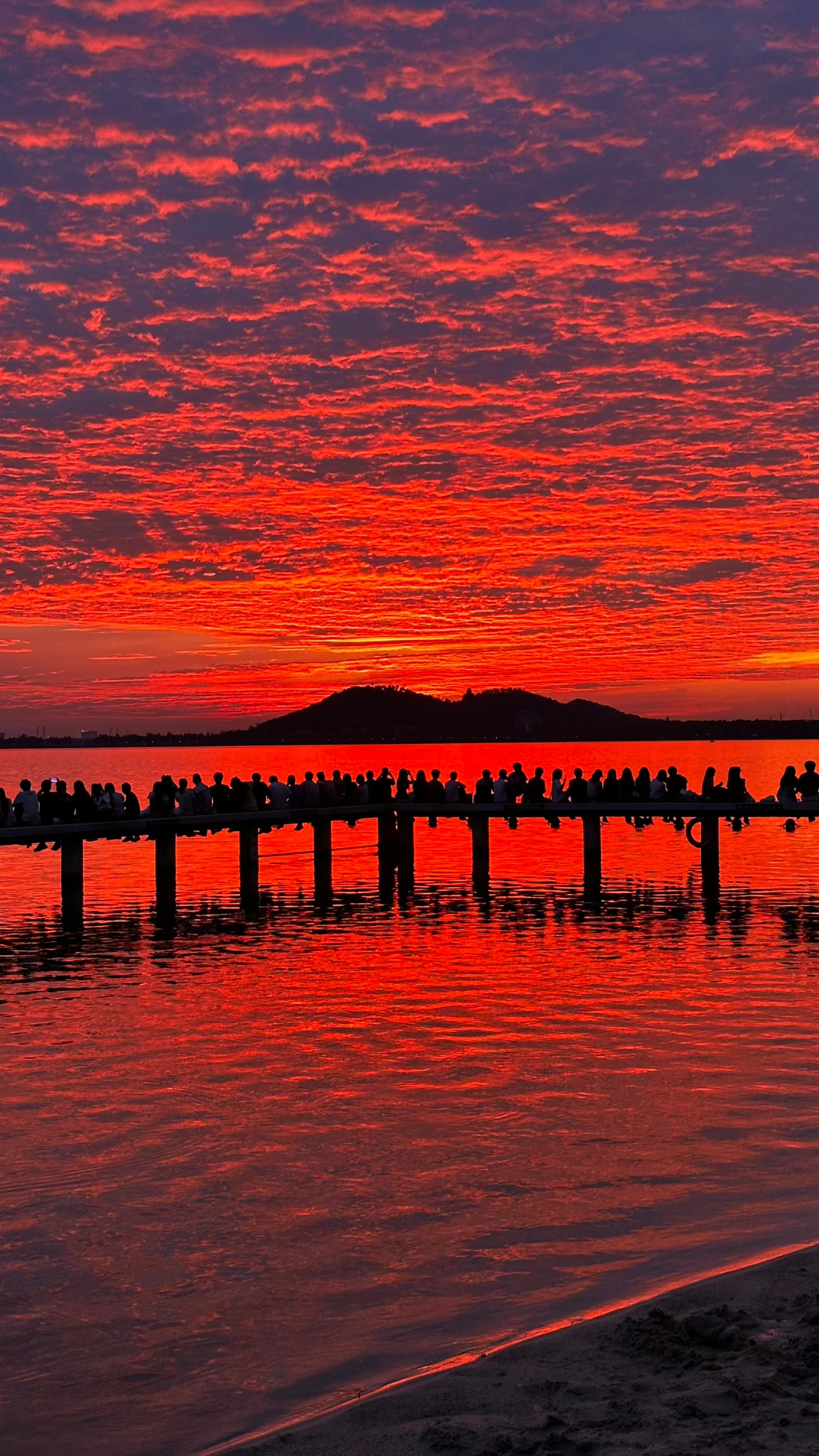 “看到太阳跃出湖面,浮光跃金的那一刻,觉得一切都值了。” 在社交平台上,众多博主连发十几张图,分享来此看完日出的心情。他们整理好“攻略”:一定要早到,最好4时20分就来抢最佳机位;穿浅色衣服,你大概率能拍到你的“人生照片”;栈桥人多,要小心别让手机掉进湖里……