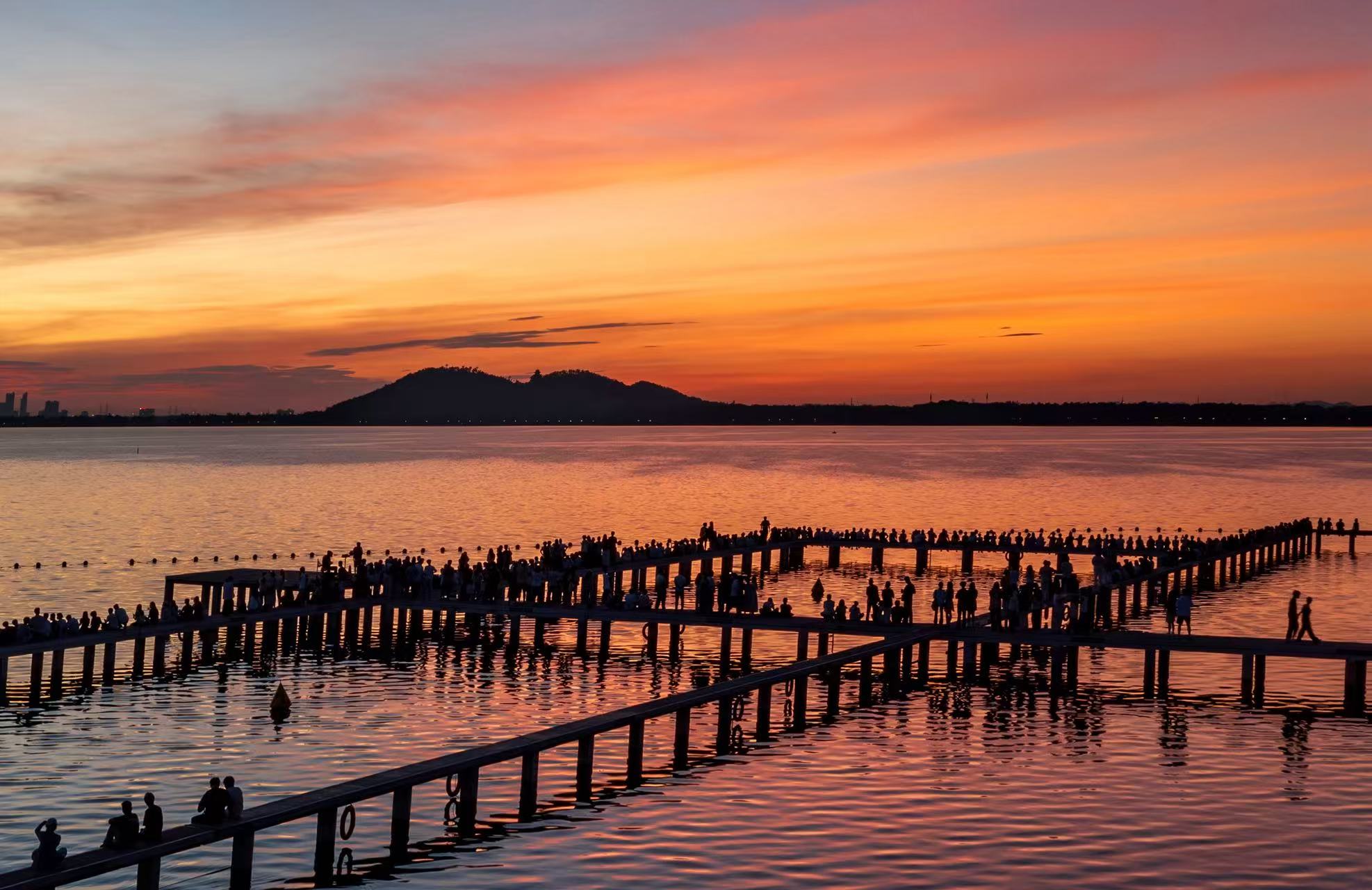 有网友记录了今夏来凌波门看“世纪朝霞”的感受:4时50分左右,先是天际线裂开一道金光,之后它像是被点燃的火焰,红的、橙的、粉的、金的……整片天空都在“燃烧”,湖水也被染成橘子海,手机拍不出它万分之一的美……5时30分,耳边的鸟鸣声逐渐清晰,湖畔开始冒出晨跑的人、踩水的小孩子……